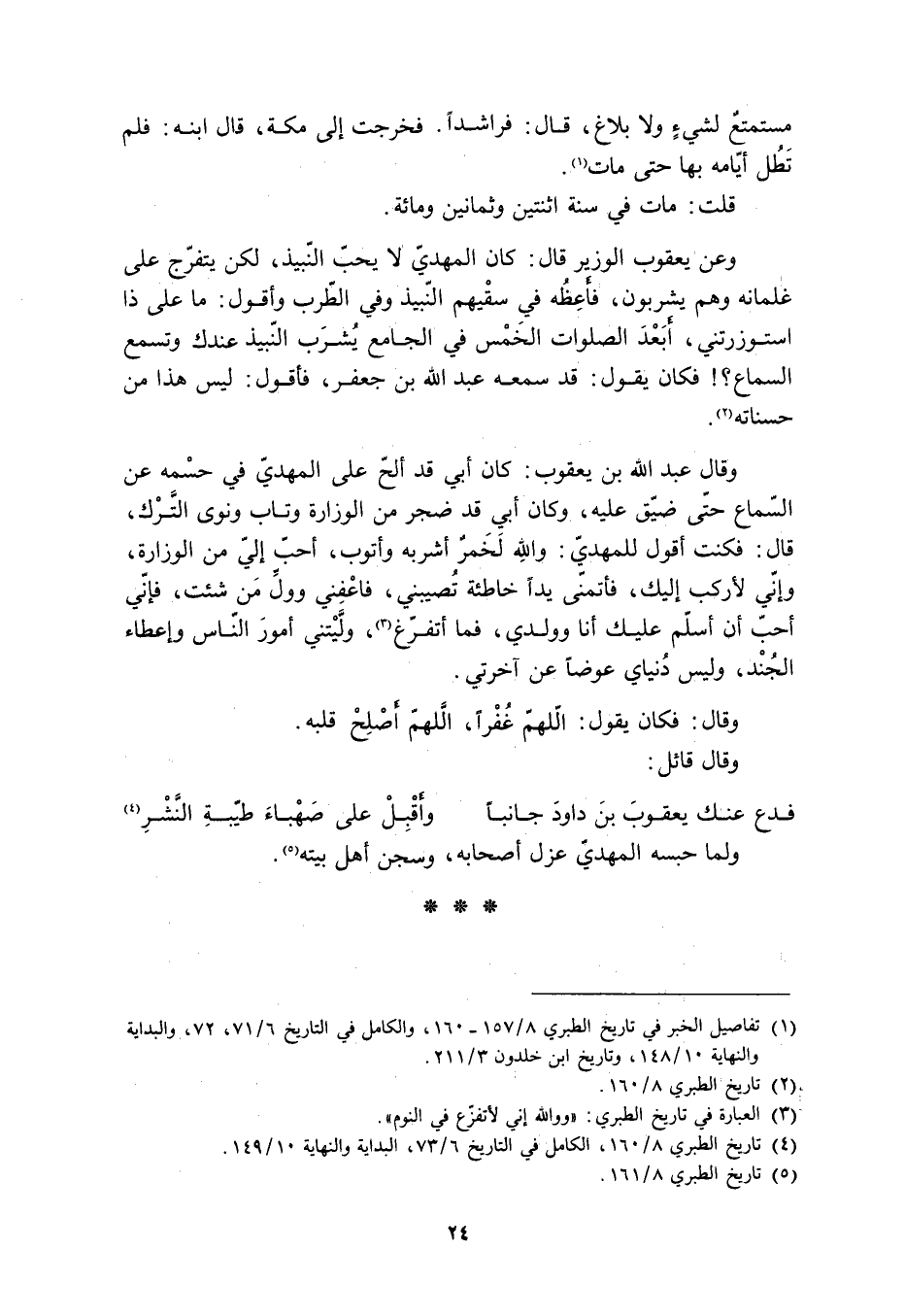 وَعَنْ يَعْقُوبَ الْوَزِيرِ قَالَ: كَانَ الْمَهْدِيُّ لا يُحِبُّ النَّبِيذَ، لَكِنْ يَتَفَرَّجُ عَلَى غِلْمَانِهِ وَهُمْ يَشْرَبُونَ، فَأَعِظُهُ فِي سَقْيِهِمُ النَّبِيذَ وَفِي الطَّرَبِ وَأَقُولُ: مَا عَلَى ذَا اسْتَوْزَرْتَنِي، أَبَعْدَ الصَّلَوَاتِ الْخَمْسِ فِي الْجَامِعِ يُشْرَبُ النَّبِيذُ عِنْدَكَ وَتَسْمَعُ السَّمَاعَ؟! فَكَانَ يَقُولُ: قَدْ سَمِعَهُ عَبْدُ اللَّهِ بْنُ جَعْفَرٍ، فَأَقُولُ: لَيْسَ هَذَا مِنْ حَسَنَاتِهِ [2] .