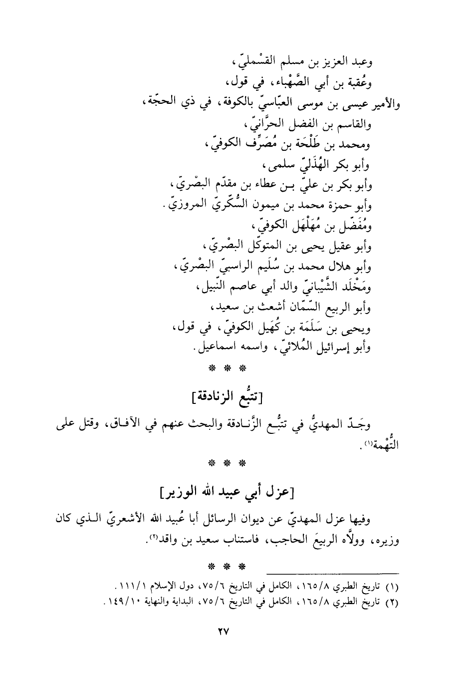 وَجَدَّ الْمَهْدِيُّ فِي تَتَبُّعِ الزَّنَادِقَةِ وَالْبَحْثِ عَنْهُمْ فِي الآفَاقِ، وَقَتَلَ عَلَى التُّهْمَةِ [1] .