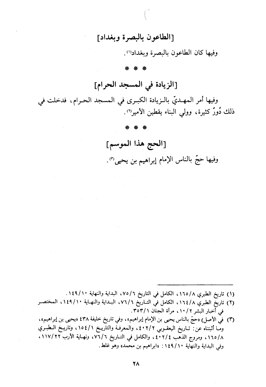 [3] في الأصل) «حجّ بالناس يحيى بن الإمام إبراهيم» ، وفي تاريخ خليفة 438 «يحيى بن إبراهيم» ، وما أثبتناه عن: تاريخ اليعقوبي 2/ 402، والمعرفة والتاريخ 1/ 154، وتاريخ الطبري 8/ 165، ومروج الذهب 4/ 402، والكامل في التاريخ 6/ 76، ونهاية الأرب 22/ 117، وفي البداية والنهاية 10/ 149: «إبراهيم بن محمد» وهو غلط.