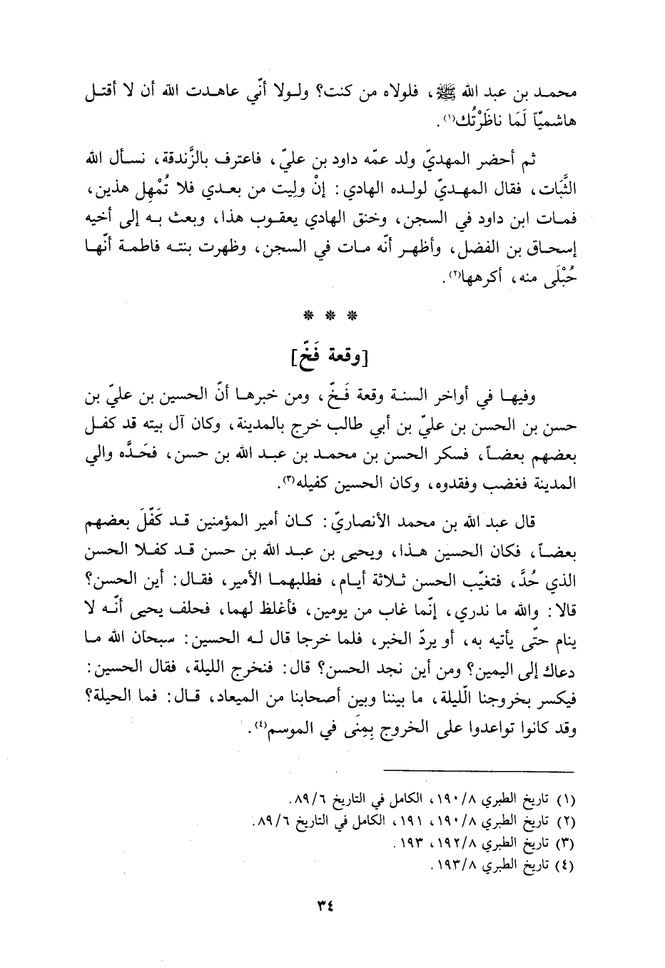 وَفِيهَا فِي أَوَاخِرِ السَّنَةِ وَقْعَةُ فَخٍّ، وَمِنْ خَبَرِهَا أَنَّ الْحُسَيْنَ بْنَ عَلِيِّ بْنِ حَسَنِ بْنِ الْحَسَنِ بْنِ عَلِيِّ بْنِ أَبِي طَالِبٍ خَرَجَ بِالْمَدِينَةِ، وَكَانَ آلُ بَيْتِهِ قَدْ كَفَلَ بَعْضُهُمْ بَعْضًا، فَسَكِرَ الْحَسَنُ بْنُ مُحَمَّدِ بْنِ عَبْدِ اللَّهِ بْنِ حَسَنٍ، فَحَدَّهُ وَالِي الْمَدِينَةِ فَغَضِبَ وَفَقَدُوهُ، وَكَانَ الْحُسَيْنُ كَفِيلَهُ [3] .