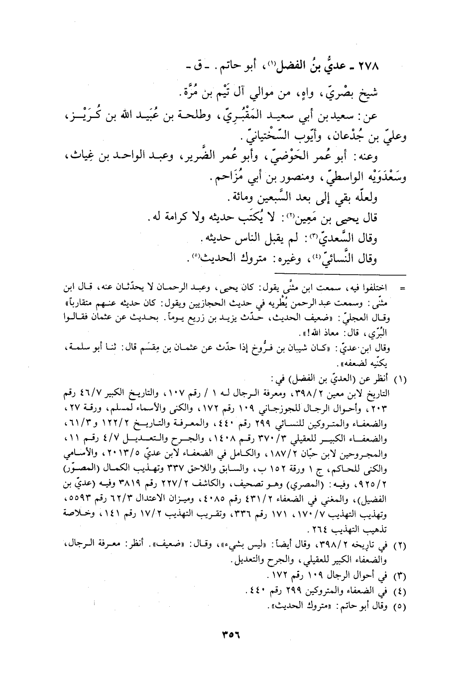 التاريخ لابن معين 2/ 398، ومعرفة الرجال له 1/ رقم 107، والتاريخ الكبير 7/ 46 رقم 203، وأحوال الرجال للجوزجانيّ 109 رقم 172، والكنى والأسماء لمسلم، ورقة 27، والضعفاء والمتروكين للنسائي 299 رقم 440، والمعرفة والتاريخ 2/ 122 و 3/ 61، والضعفاء الكبير للعقيليّ 3/ 370 رقم 1408، والجرح والتعديل 7/ 4 رقم 11، والمجروحين لابن حبّان 2/ 187، والكامل في الضعفاء لابن عديّ 5/ 2013، والأسامي والكنى للحاكم، ج 1 ورقة 152 ب، والسابق واللاحق 337 وتهذيب الكمال (المصوّر) 2/ 925، وفيه: (المصري) وهو تصحيف، والكاشف 2/ 227 رقم 3819 وفيه (عديّ بن الفضيل) ، والمغني في الضعفاء 2/ 431 رقم 4085، وميزان الاعتدال 3/ 62 رقم 5593، وتهذيب التهذيب 7/ 170، 171 رقم 336، وتقريب التهذيب 2/ 17 رقم 141، وخلاصة تذهيب التهذيب 264.