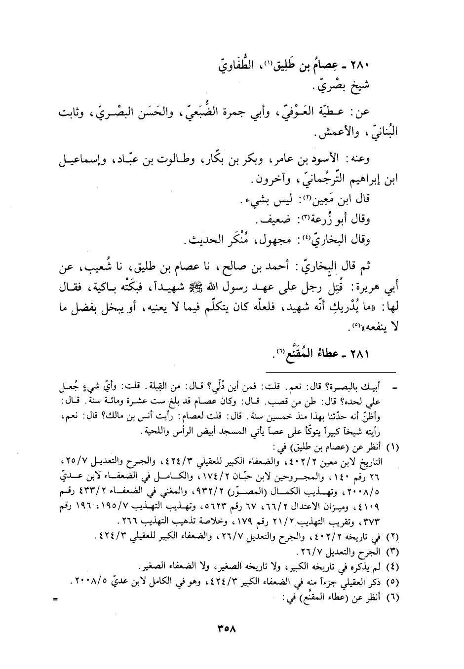 ثُمَّ قَالَ الْبُخَارِيُّ: أَحْمَدُ بن صالح، نا عصام بْنُ طَلِيقٍ، نَا شُعَيْبٌ، عَنْ أَبِي هُرَيْرَةَ: قُتِلَ رَجُلٌ عَلَى عَهْدِ رَسُولِ اللَّهِ صَلَّى اللَّهُ عَلَيْهِ وَسَلَّمَ شَهِيدًا، فَبَكَتْهُ بَاكِيَةٌ، فَقَالَ لَهَا: «مَا يُدْرِيكِ أَنَّهُ شَهِيدٌ، فَلَعَلَّهُ كَانَ يَتَكَلَّمُ فِيمَا لا يَعْنِيهِ، أَوْ يَبْخَلُ بِفَضْلِ ما لا ينفعه» [5] . 281- عطاء المقنّع [6] .