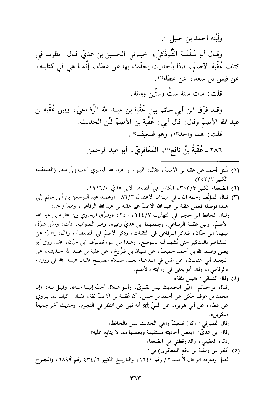 وقال الحافظ ابن حجر في التهذيب 7/ 244، 245: «وفرّق البخاري بين عقبة بن عبد الله الأصمّ، وبين عقبة الرفاعيّ، وجمعهما ابن عديّ وغيره، وهو الصواب. قلت: وممّن فرّق بينهما ابن حبّان، فذكر الرفاعيّ في الثقات، وذكر الأصمّ في الضعفاء، وقال: يتفرّد عن المشاهير بالمناكير حتى يشهد له بالوضع، وهذا من سوء تصرّف ابن حبّان، فقد روى أبو يعلى وعبد الله بن أحمد جميعا، عن شيبان بن فرّوخ، عن عقبة بن عبد الله حديثه، عن الجعد أبي عثمان، عن أنس في الدعاء بعد صلاة الصبح فقال عبد الله في روايته «الرفاعيّ» ، وقال أبو يعلى في روايته «الأصم» .