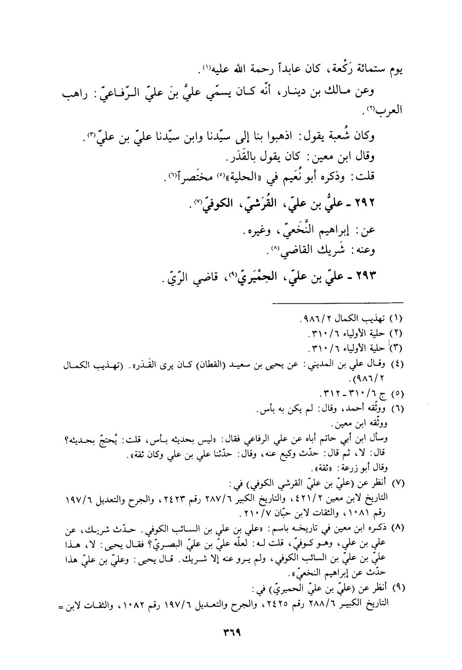 [8] ذكره ابن معين في تاريخه باسم: «علي بن علي بن السائب الكوفي. حدّث شريك، عن علي بن علي، وهو كوفيّ، قلت له: لعلّه عليّ بن عليّ البصريّ؟ فقال يحيى: لا، هذا عليّ بن عليّ بن السائب الكوفي، ولم يرو عنه إلا شريك. قال يحيى: وعليّ بن عليّ هذا حدّث عن إبراهيم النخعيّ» .