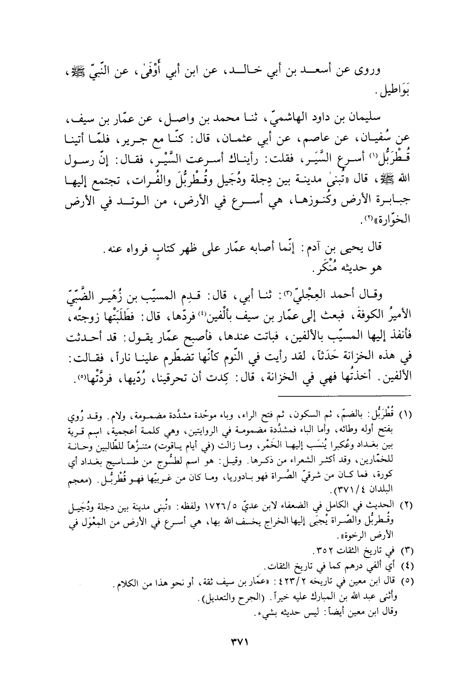سُلَيْمَانُ بْنُ دَاوُدَ الْهَاشِمِيُّ، ثَنَا مُحَمَّدُ بْنُ وَاصِلٍ، عَنْ عَمَّارِ بْنِ سَيْفٍ، عَنْ سُفْيَانَ، عَنْ عَاصِمٍ، عَنْ أَبِي عُثْمَانَ، قَالَ: كُنَّا مَعَ جَرِيرٍ، فَلَمَّا أَتَيْنَا قطربُّل [1] أَسْرَعَ السَّيْرَ، فَقُلْتُ: رَأَيْنَاكَ أَسْرَعْتَ السَّيْرَ، فَقَالَ: إِنَّ رَسُولَ اللَّهِ صَلَّى اللَّهُ عَلَيْهِ وَسَلَّمَ، قَالَ «تُبْنَى مَدِينَةٌ بَيْنَ دِجْلَةَ وَدُجَيْلٍ وقطربُّل وَالْفُرَاتِ، تَجْتَمِعُ إِلَيْهَا جَبَابِرَةُ الأَرْضِ وَكُنُوزُهَا، هِيَ أَسْرَعُ فِي الأَرْضِ، مِنَ الْوَتَدِ فِي الأَرْضِ الْخَوَّارَةِ» [2] . قَالَ يَحْيَى بْنُ آدَمَ: إِنَّمَا أَصَابَهُ عَمَّارٌ عَلَى ظَهْرِ كِتَابٍ فَرَوَاهُ عَنْهُ.