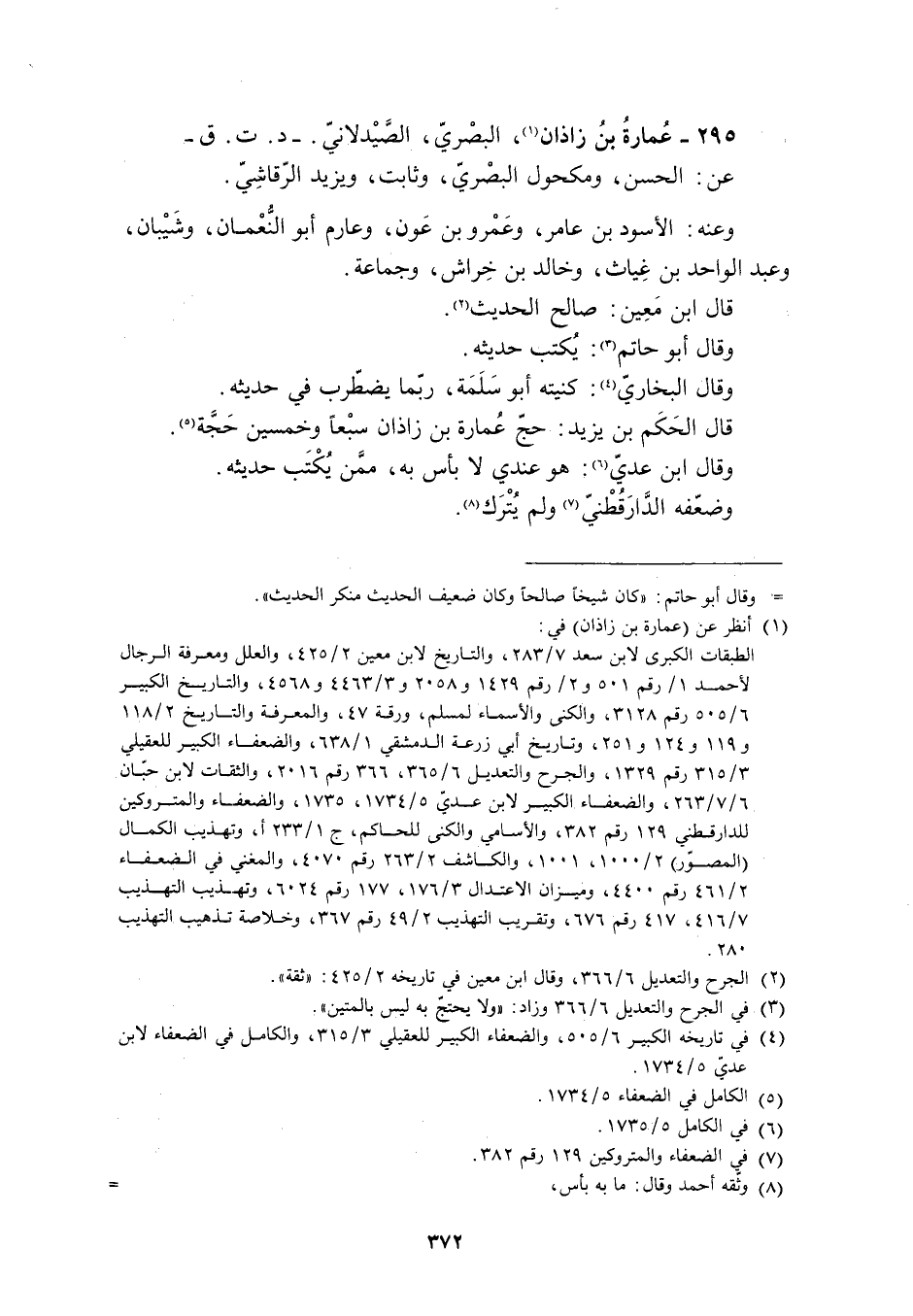 295- عُمَارَةُ بْنُ زَاذَانَ [1] ، الْبَصْرِيُّ، الصَّيْدَلانِيُّ. - د. ت. ق- عن: الحسن، ومكحول البصريّ، وثابت، ويزيد الرَّقَاشِيِّ.