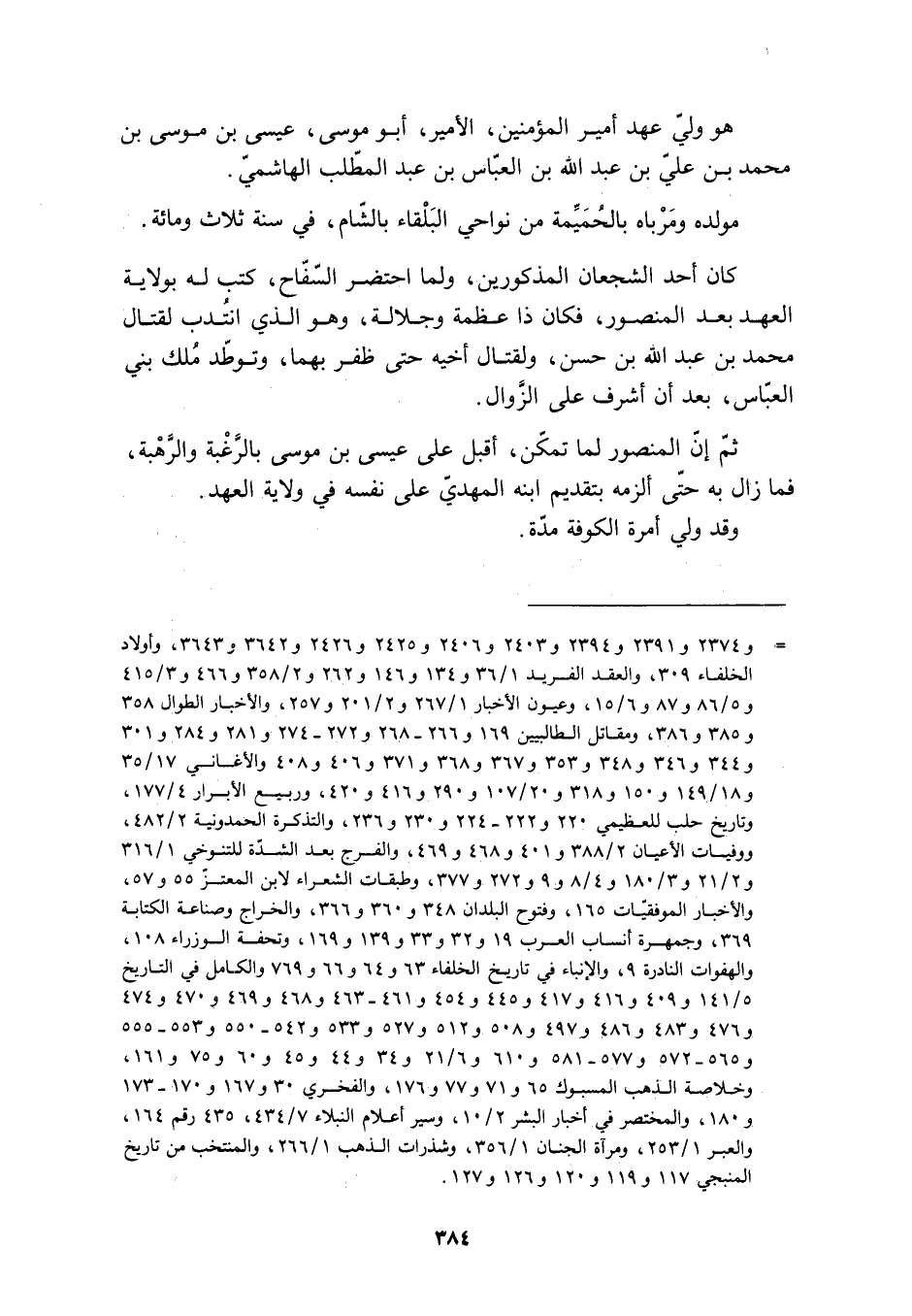 [ () ] و 2374 و 2391 و 2394 و 2403 و 2406 و 2425 و 2426 و 3642 و 3643، وأولاد الخلفاء 309، والعقد الفريد 1/ 36 و 134 و 146 و 262 و 2/ 358 و 466 و 3/ 415 و 5/ 86 و 87 و 6/ 15، وعيون الأخبار 1/ 267 و 2/ 201 و 257، والأخبار الطوال 358 و 385 و 386، ومقاتل الطالبيين 169 و 266- 268 و 272- 274 و 281 و 284 و 301 و 344 و 346 و 348 و 353 و 367 و 368 و 371 و 406 و 408 والأغاني 17/ 35 و 18/ 149 و 150 و 318 و 20/ 107 و 290 و 416 و 420، وربيع الأبرار 4/ 177، وتاريخ حلب للعظيميّ 220 و 222- 224 و 230 و 236، والتذكرة الحمدونية 2/ 482، ووفيات الأعيان 2/ 388 و 401 و 368 و 469، والفرج بعد الشدّة للتنوخي 1/ 316 و 2/ 21 و 3/ 180 و 4/ 8 و 9 و 272 و 377، وطبقات الشعراء لابن المعتزّ 55 و 57، والأخبار الموفقيّات 165، وفتوح البلدان 348 و 360 و 366، والخراج وصناعة الكتابة 369، وجمهرة أنساب العرب 19 و 32 و 33 و 139 و 169، وتحفة الوزراء 108، والهفوات النادرة 9، والإنباء في تاريخ الخلفاء 63 و 64 و 66 و 769 والكامل في التاريخ 5/ 141 و 409 و 416 و 417 و 445 و 454 و 461- 463 و 468 و 469 و 470 و 474 و 476 و 483 و 486 و 497 و 508 و 512 و 527 و 533 و 542- 550 و 553- 555 و 565- 572 و 577- 581 و 610 و 6/ 21 و 34 و 44 و 45 و 60 و 75 و 161، وخلاصة الذهب المسبوك 65 و 71 و 77 و 176، والفخري 30 و 167 و 170- 173 و 180، والمختصر في أخبار البشر 2/ 10، وسير أعلام النبلاء 7/ 434، 435 رقم 164، والعبر 1/ 253، ومرآة الجنان 1/ 356، وشذرات الذهب 1/ 266، والمنتخب من تاريخ المنبجي 117 و 119 و 120 و 126 و 127.