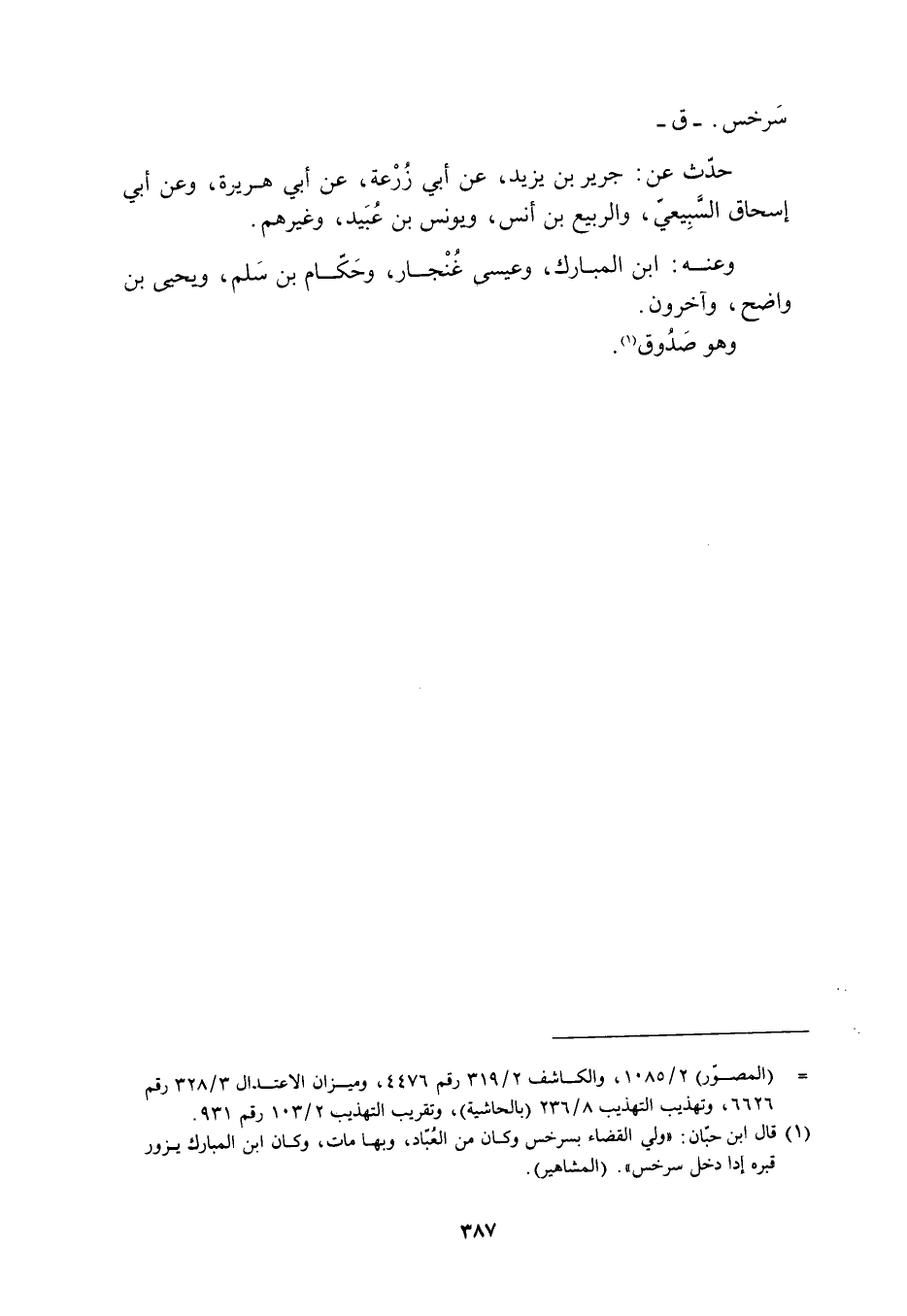 [ () ] (المصوّر) 2/ 1085، والكاشف 2/ 319 رقم 4476، وميزان الاعتدال 3/ 328 رقم 6626، وتهذيب التهذيب 8/ 236 (بالحاشية) ، وتقريب التهذيب 2/ 103 رقم 931.