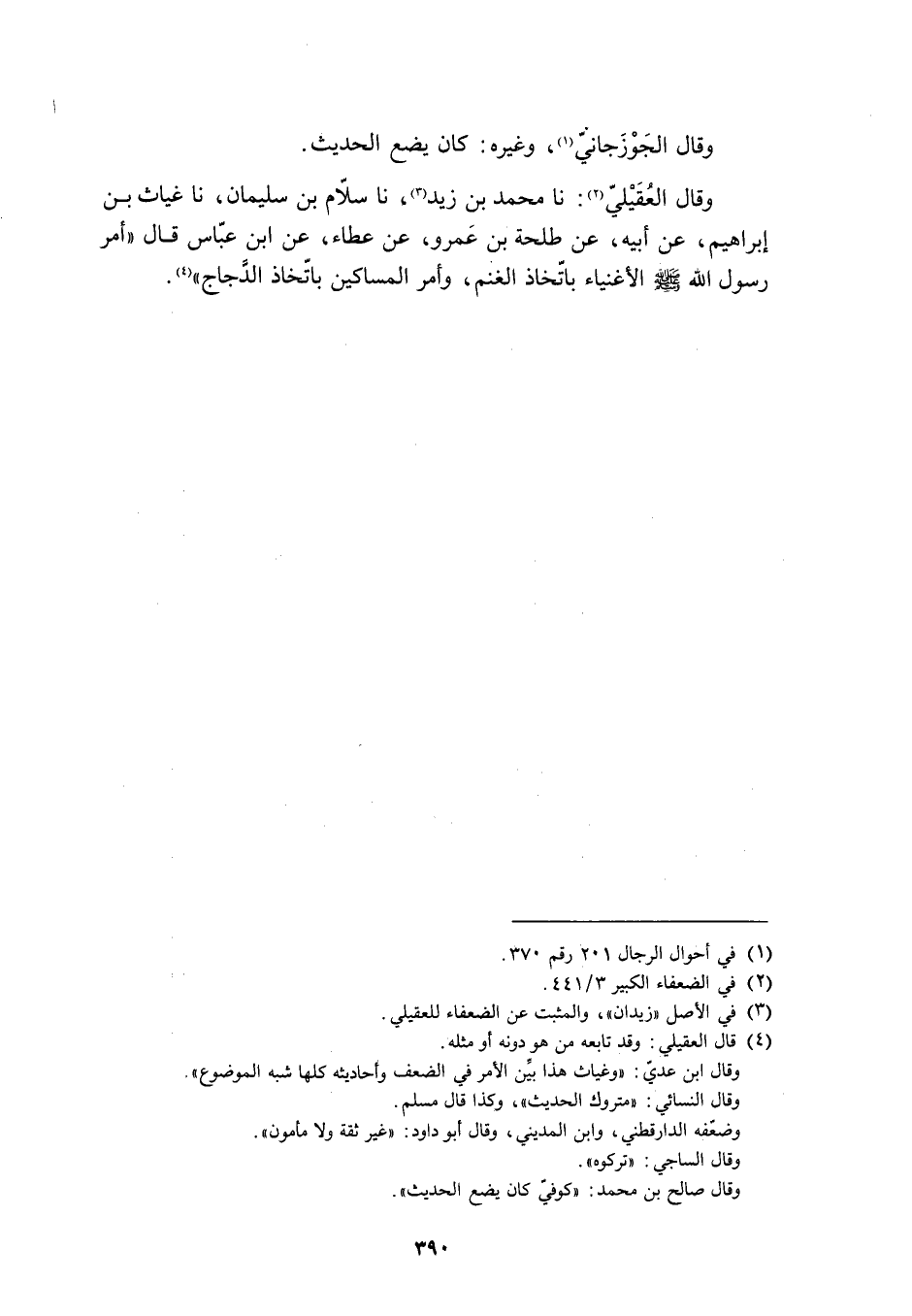 وَقَالَ الْعُقَيْلِيُّ [2] : نَا مُحَمَّدُ بْنُ زَيْدٍ [3] ، نَا سَلامُ بْنُ سُلَيْمَانَ، نَا غِيَاثُ بْنُ إِبْرَاهِيمَ، عَنْ أَبِيهِ، عَنْ طَلْحَةُ بْنُ عَمْرٍو، عَنْ عَطَاءٍ، عَنِ ابْنِ عَبَّاسٍ قَالَ «أَمَرَ رَسُولُ اللَّهِ صَلَّى اللَّهُ عَلَيْهِ وَسَلَّمَ الأَغْنِيَاءَ بِاتِّخَاذِ الْغَنَمِ، وأمر المساكين باتّخاذ الدّجاج» [4] .