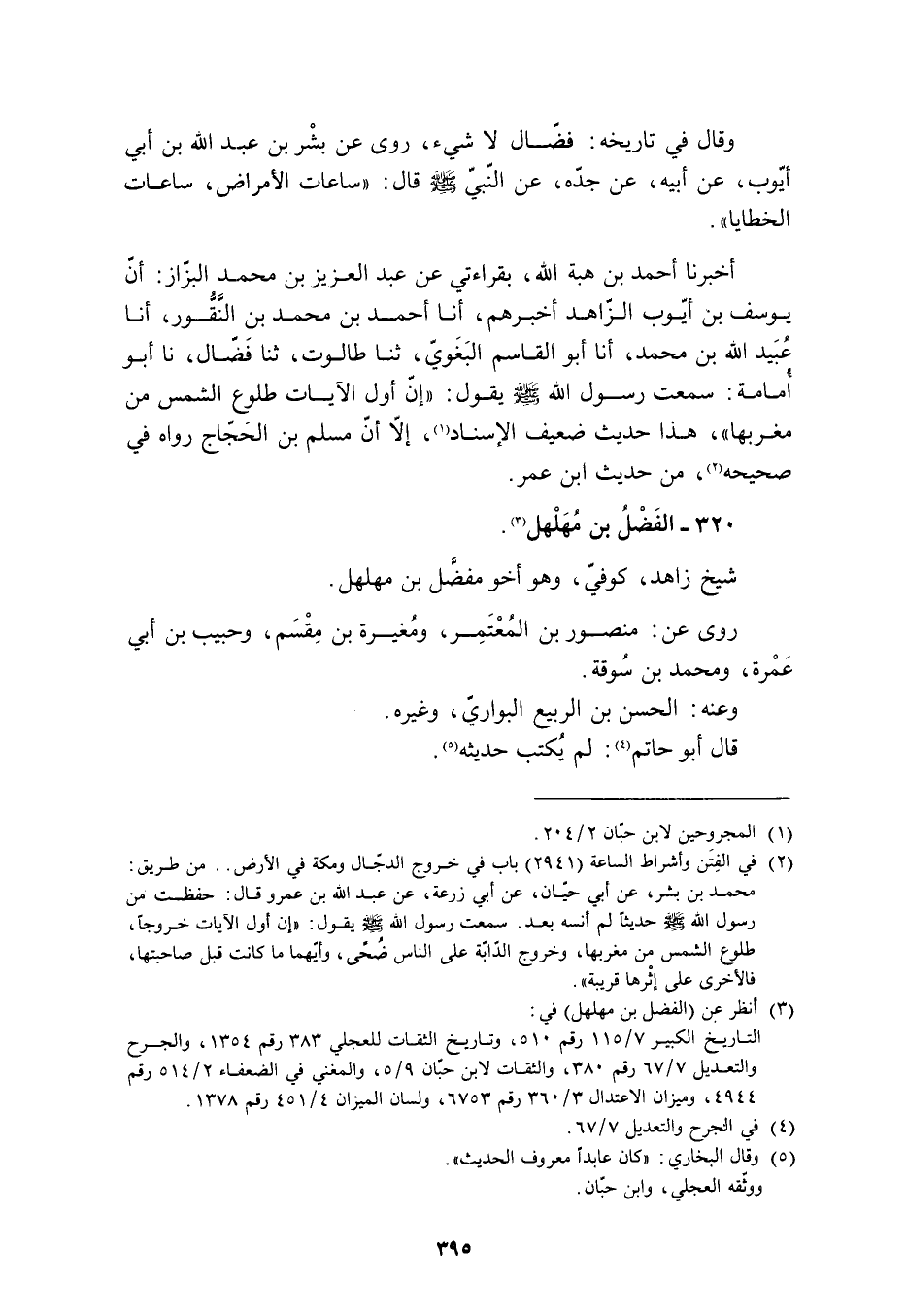 وَقَالَ فِي تَارِيخِهِ: فَضَّالٌ لا شَيْءَ، رَوَى عَنْ بِشْرِ بْنِ عَبْدِ اللَّهِ بْنِ أَبِي أَيُّوبَ، عَنْ أَبِيهِ، عَنْ جَدِّهِ، عَنِ النَّبِيِّ صَلَّى اللَّهُ عَلَيْهِ وَسَلَّمَ قَالَ: «سَاعَاتُ الأَمْرَاضِ، سَاعَاتُ الْخَطَايَا» . أَخْبَرَنَا أَحْمَدُ بْنُ هِبَةِ اللَّهِ، بقراءتي عن عبد العزيز بن محمد البزّاز: أَنَّ يُوسُفَ بْنَ أَيُّوبَ الزَّاهِدَ أَخْبَرَهُمْ، أَنَا أَحْمَدُ بْنُ مُحَمَّدِ بْنِ النَّقُورِ، أَنَا عُبَيْدُ اللَّهِ بْنُ مُحَمَّدٍ، أَنَا أَبُو الْقَاسِمِ الْبَغَوِيُّ، ثَنَا طَالُوتُ، ثَنَا فَضَّالٌ، نَا أَبُو أُمَامَةَ: سَمِعْتُ رَسُولَ اللَّهِ صَلَّى اللَّهُ عَلَيْهِ وَسَلَّمَ يَقُولُ: «إِنَّ أَوَّلَ الآيَاتِ طُلُوعُ الشَّمْسِ مِنْ مَغْرِبِهَا» ، هَذَا حَدِيثٌ ضَعِيفُ الإِسْنَادِ [1] ، إِلا أَنَّ مُسْلِمَ بْنَ الْحَجَّاجِ رَوَاهُ فِي صَحِيحِهِ [2] ، مِنْ حَدِيثِ ابْنِ عُمَرَ. 320- الْفَضْلُ بْنُ مُهَلْهَلٍ [3] .