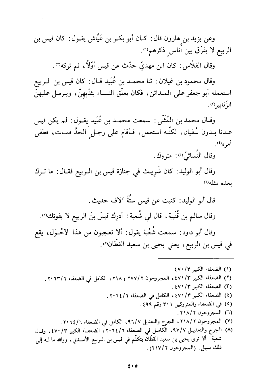 [8] الجرح والتعديل 7/ 97، الكامل في الضعفاء 6/ 2064، الضعفاء الكبير 3/ 470، وقال شعبة: ألا ترى يحيى بن سعيد القطّان يتكلّم في قيس بن الربيع الأسدي، وو الله ما له إلى ذلك سبيل. (المجروحون 2/ 217) .