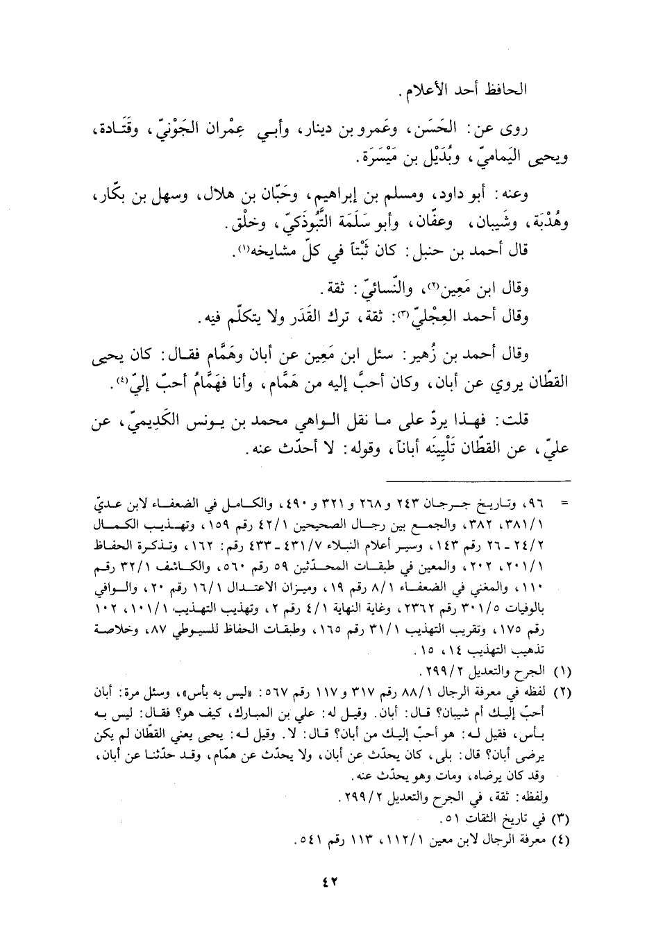 [2] لفظه في معرفة الرجال 1/ 88 رقم 317 و 117 رقم 567: «ليس به بأس» ، وسئل مرة: أبان أحبّ إليك أم شيبان؟ قال: أبان. وقيل له: عليّ بن المبارك، كيف هو؟ فقال: ليس به بأس، فقيل له: هو أحبّ إليك من أبان؟ قال: لا. وقيل له: يحيى يعني القطّان لم يكن يرضى أبان؟ قال: بلى، كان يحدّث عن أبان، ولا يحدّث عن همّام، وقد حدّثنا عن أبان، وقد كان يرضاه، ومات وهو يحدّث عنه.