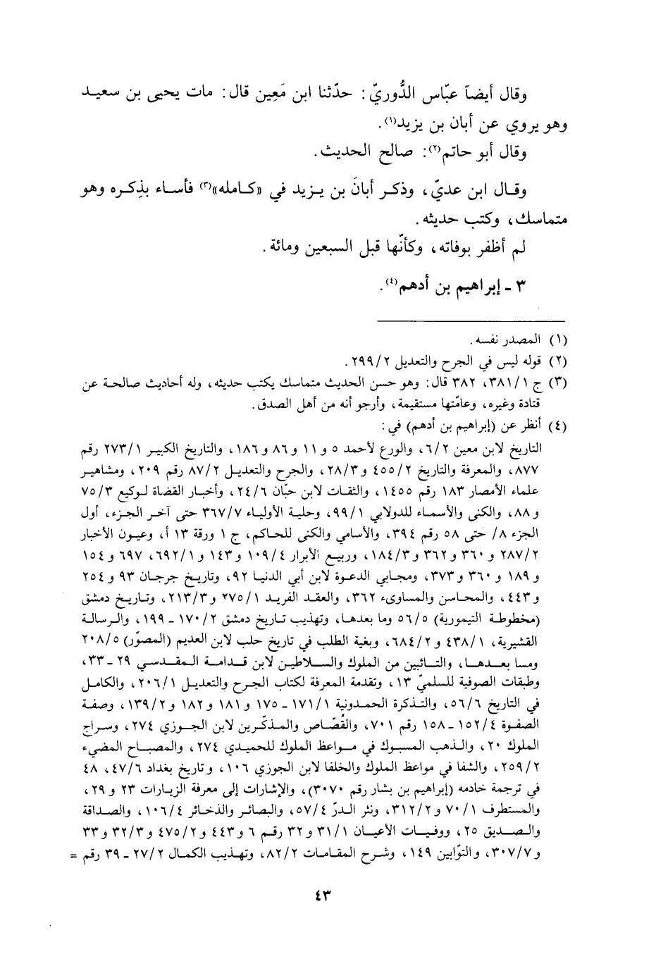 [3] ج 1/ 381، 382 قال: وهو حسن الحديث متماسك يكتب حديثه، وله أحاديث صالحة عن قتادة وغيره، وعامّتها مستقيمة، وأرجو أنه من أهل الصدق.