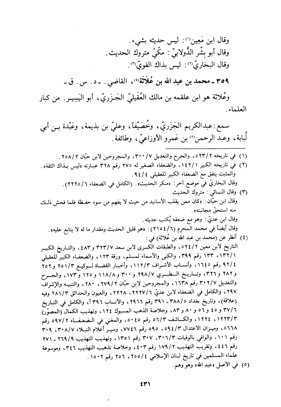 359- مُحَمَّدُ بْنُ عَبْدِ اللَّهِ بْنِ عُلاثَةَ [4] ، الْقَاضِي. - د. س. ق- وَعُلاثَةَ هُوَ ابْنُ عَلْقَمَةَ بْنِ مَالِكٍ الْعُقَيْلِيُّ الْجَزَرِيُّ، أَبُو الْيَسِيرِ. مِنْ كِبَارِ الْعُلَمَاءِ.