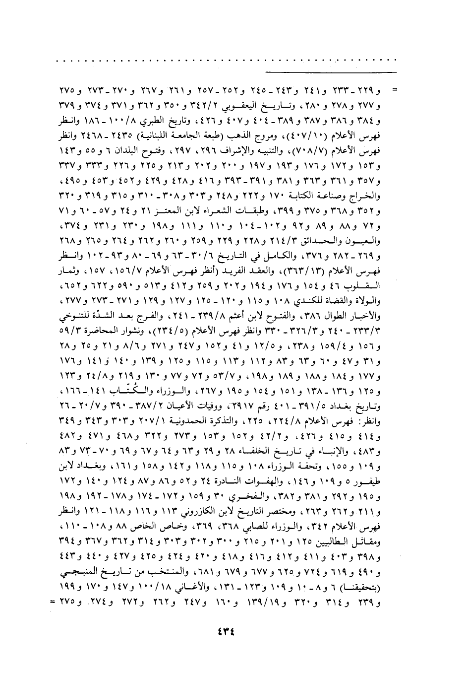 [ () ] و 229- 233 و 241 و 243- 245 و 252- 257 و 261 و 267 و 270- 273 و 275 و 277 و 278 و 280، وتاريخ اليعقوبي 2/ 342 و 350 و 362 و 371 و 374 و 379 و 384 و 386 و 387 و 389- 404 و 407 و 426، وتاريخ الطبري 8/ 100- 186 وانظر فهرس الأعلام (10/ 407) ، ومروج الذهب (طبعة الجامعة اللبنانية) 2435- 2468 وانظر فهرس الأعلام (7/ 708) ، والتنبيه والإشراف 296، 297، وفتوح البلدان 6 و 55 و 143 و 153 و 172 و 176 و 193 و 197 و 200 و 202 و 213 و 225 و 226 و 333 و 337 و 357 و 361 و 363 و 381 و 391- 393 و 416 و 428 و 429 و 452 و 453 و 495، والخراج وصناعة الكتابة 170 و 222 و 248 و 303 و 308- 310 و 315 و 319 و 320 و 352 و 368 و 375 و 399، وطبقات الشعراء لابن المعتز 21 و 24 و 57- 60 و 71 و 72 و 88 و 89 و 92 و 102- 104 و 110 و 111 و 198 و 230 و 231 و 374، والعيون والحدائق 3/ 214 و 228 و 259 و 260 و 262 و 264 و 265 و 268 و 269- 282 و 376، والكامل في التاريخ 6/ 30- 63 و 69- 80 و 93- 102 وانظر فهرس الأعلام (13/ 363) ، والعقد الفريد (انظر فهرس الأعلام 7/ 156، 157، وثمار القلوب 46 و 154 و 176 و 194 و 202 و 259 و 412 و 513 و 590 و 622 و 652، والولاة والقضاة للكندي 108 و 115 و 120- 125 و 127 و 129 و 271- 273 و 277، والأخبار الطوال 386، والفتوح لابن أعثم 8/ 239- 241، والفرج بعد الشدّة للتنوخي 3/ 233- 240 و 3/ 326- 330 وانظر فهرس الأعلام (5/ 234) ، ونشوار المحاضرة 3/ 59 و 156 و 4/ 159 و 238، و 5/ 12 و 41 و 152 و 247 و 271 و 6/ 8 و 21 و 25 و 28 و 31 و 47 و 60 و 63 و 83 و 112 و 113 و 115 و 125 و 139 و 140 و 141 و 176 و 177 و 184 و 188 و 189 و 198، و 7/ 53 و 72 و 77 و 130 و 219 و 8/ 24 و 123 و 125 و 136- 138 و 151 و 154 و 195 و 267، والوزراء والكتّاب 141- 166، وتاريخ بغداد 5/ 391- 401 رقم 2917، ووفيات الأعيان 2/ 387- 390 و 7/ 20- 26 وانظر: فهرس الأعلام 8/ 224، 225، والتذكرة الحمدونية 1/ 207 و 303 و 343 و 349 و 414 و 415 و 426، و 2/ 42 و 152 و 153 و 273 و 322 و 468 و 471 و 482 و 483، والإنباء في تاريخ الخلفاء 28 و 29 و 63 و 64 و 67 و 69 و 70- 73 و 83 و 109 و 155، وتحفة الوزراء 108 و 115 و 118 و 142 و 158 و 161، وبغداد لابن طيفور 5 و 109 و 146، والهفوات النادرة 24 و 52 و 86 و 87 و 124 و 140 و 172 و 195 و 292 و 381 و 382، والفخري 30 و 159 و 172- 174 و 178- 192 و 198 و 211 و 262 و 263، ومختصر التاريخ لابن الكازروني 113 و 116 و 118- 121 وانظر فهرس الأعلام 342، والوزراء للصابي 368، 369، وخاص الخاص 88 و 108- 110، ومقاتل الطالبيين 125 و 201 و 215 و 300 و 302 و 303 و 314 و 362 و 367 و 394 و 398 و 403 و 411 و 412 و 416 و 418 و 420 و 424 و 425 و 427 و 440 و 443 و 490 و 619 و 724 و 625 و 677 و 679 و 681، والمنتخب من تاريخ المنبجي (بتحقيقنا) 6 و 8- 10 و 109 و 123- 131، والأغاني 18/ 100 و 147 و 170 و 199 و 239 و 314 و 320 و 19/ 139 و 160 و 247 و 262 و 272 و 274 و 275