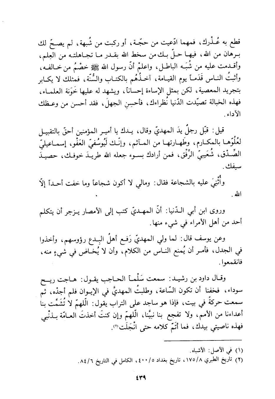 وَرَوَى ابْنُ أَبِي الدُّنْيَا: أَنَّ الْمَهْدِيَّ كَتَبَ إِلَى الأَمْصَارِ يَزْجُرُ أَنْ يَتَكَلَّمَ أَحَدٌ مِنْ أَهْلِ الأُمَرَاءِ فِي شَيْءٍ مِنْهَا.