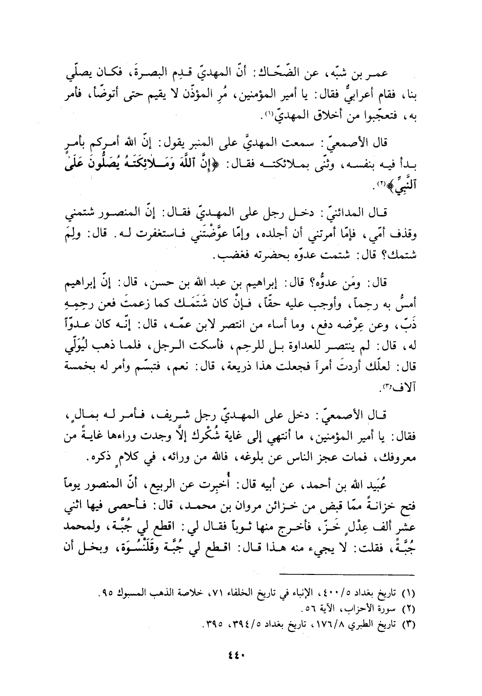 عُمَرُ بْنُ شَبَّةَ، عَنِ الضَّحَّاكِ: أَنَّ الْمَهْدِيَّ قَدِمَ الْبَصْرَةَ، فَكَانَ يُصَلِّي بِنَا، فَقَامَ أَعْرَابِيٌّ فَقَالَ: يَا أَمِيرَ الْمُؤْمِنِينَ، مُرِ الْمُؤَذِّنَ لا يُقِيمُ حَتَّى أَتَوَضَّأَ، فَأَمَرَ بِهِ، فَتَعَجَّبُوا مِنْ أَخْلاقِ الْمَهْدِيِّ [1] .