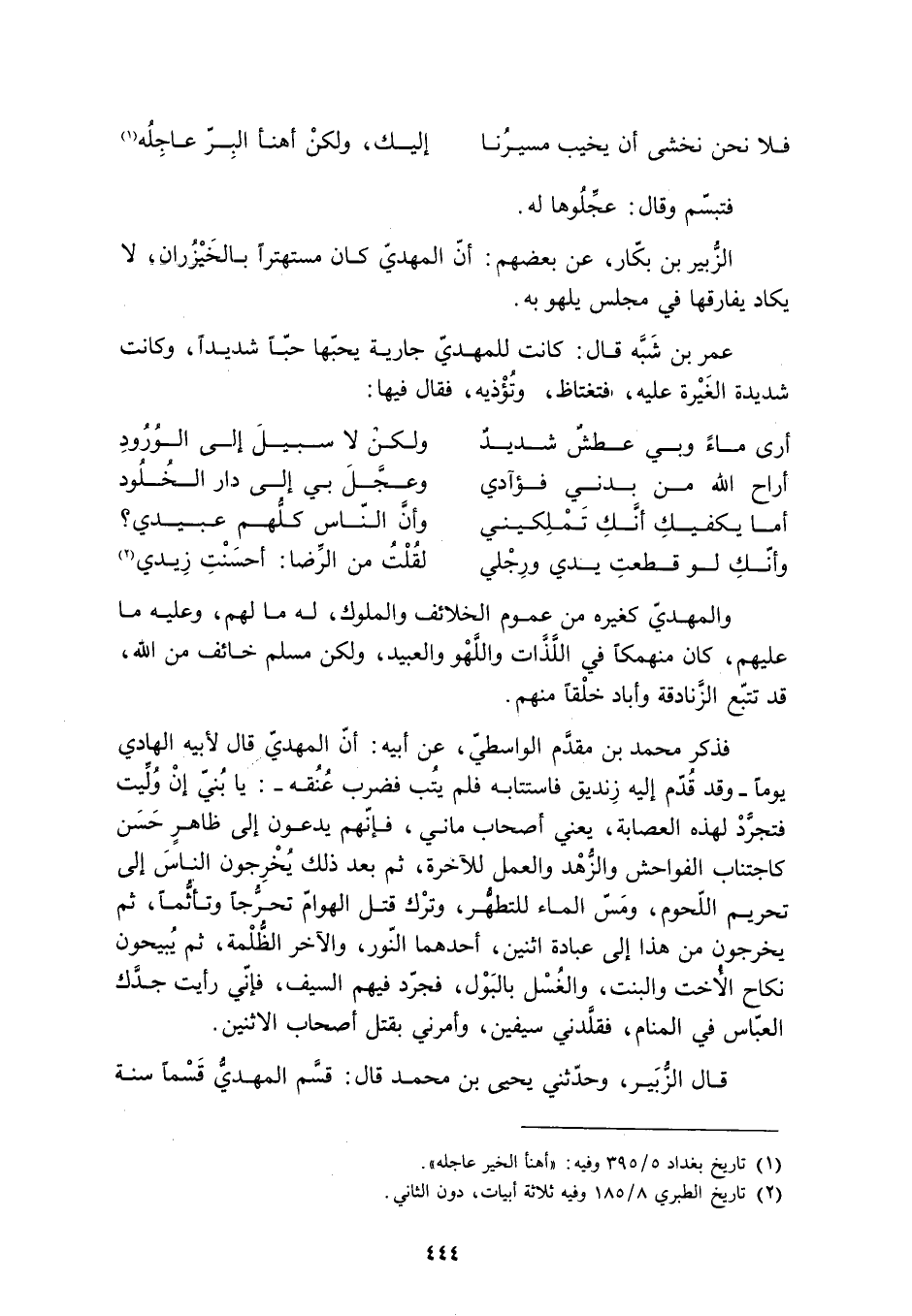 عُمَرُ بْنُ شَبَّةَ قَالَ: كَانَتْ لِلْمَهْدِيِّ جَارِيَةٌ يُحِبُّهَا حُبًّا شَدِيدًا، وَكَانَتْ شَدِيدَةَ الْغَيْرَةِ عَلَيْهِ، فَتَغْتَاظُ، وَتُؤْذِيهِ، فَقَالَ فيها: