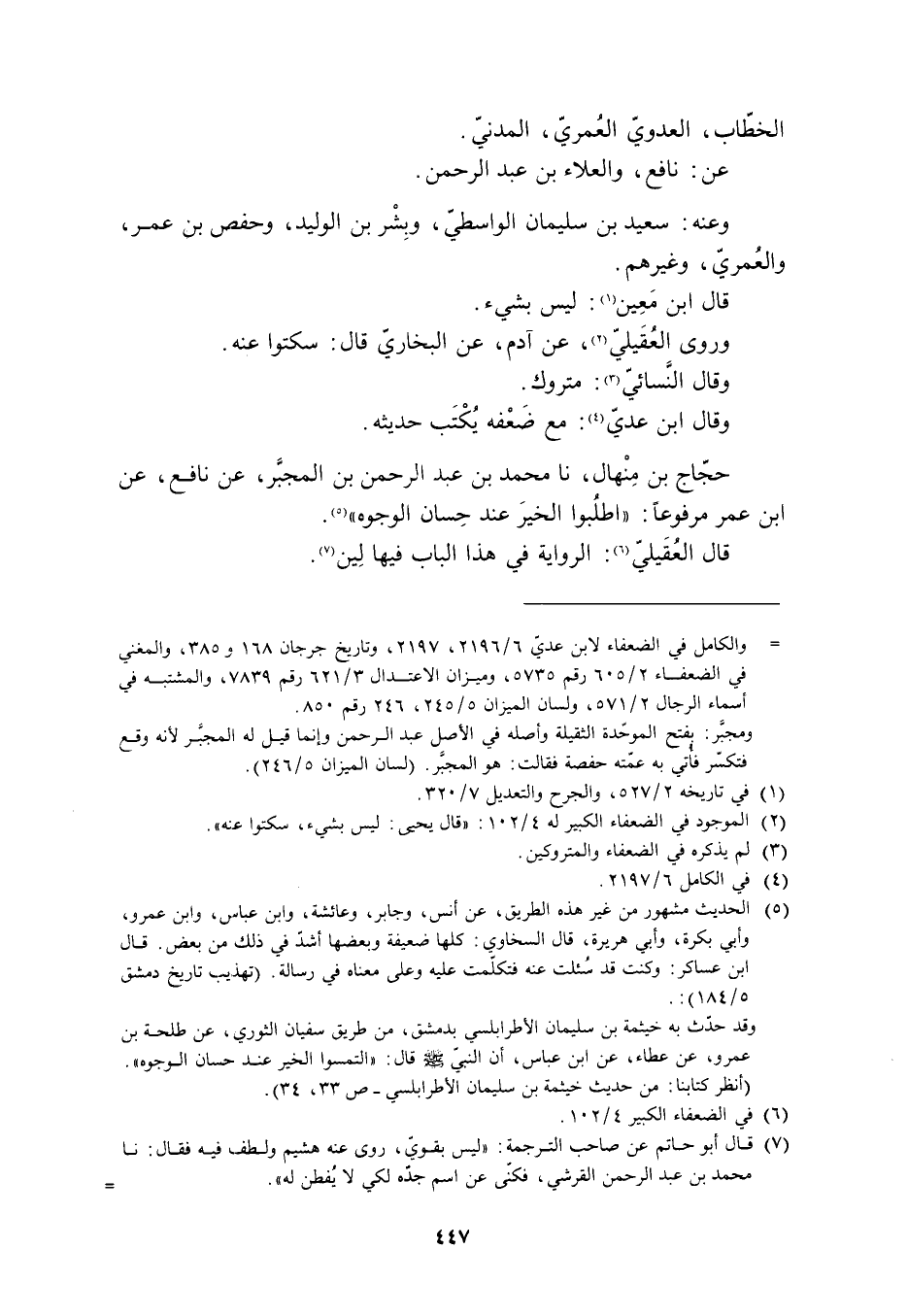 حَجَّاجُ بْنُ مِنْهَالٍ، نَا مُحَمَّدُ بْنُ عَبْدِ الرَّحْمَنِ بْنِ المجبّر، عن نافع، عن ابن عُمَرَ مَرْفُوعًا: «اطْلُبُوا الْخَيْرَ عَنْدَ حِسَانِ الْوُجُوهِ» [5] .