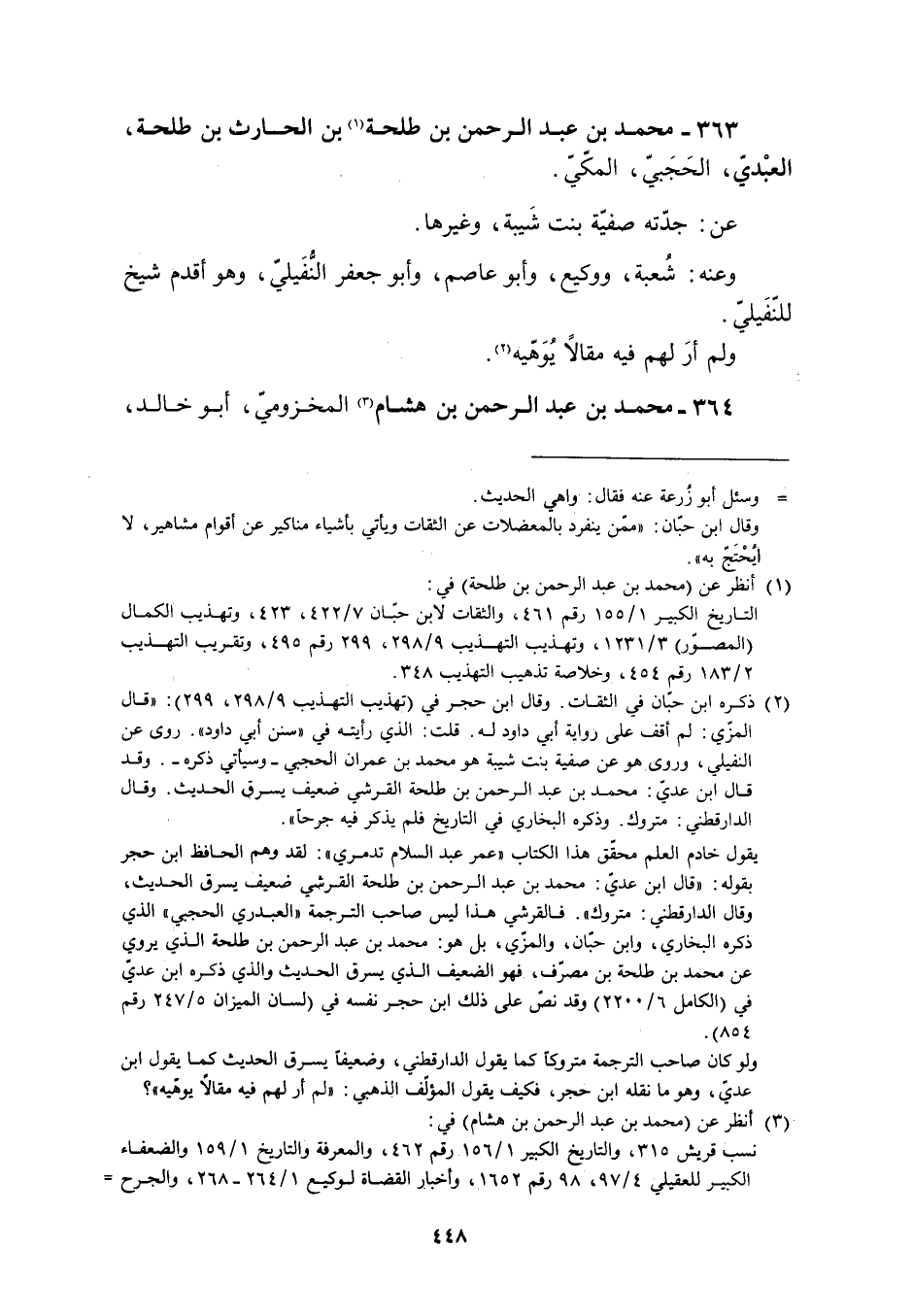 يقول خادم العلم محقّق هذا الكتاب «عمر عبد السلام تدمري» : لقد وهم الحافظ ابن حجر بقوله: «قال ابن عديّ: محمد بن عبد الرحمن بن طلحة القرشي ضعيف يسرق الحديث، وقال الدار الدّارقطنيّ: متروك» . فالقرشي هذا ليس صاحب الترجمة «العبدري الحجبي» الّذي ذكره البخاري، وابن حبّان، والمزّي، بل هو: محمد بن عبد الرحمن بن طلحة الّذي يروي عن محمد بن طلحة بن مصرّف، فهو الضعيف الّذي يسرق الحديث والّذي ذكره ابن عديّ في (الكامل 6/ 2200) وقد نصّ على ذلك ابن حجر نفسه في (لسان الميزان 5/ 247 رقم 854) .