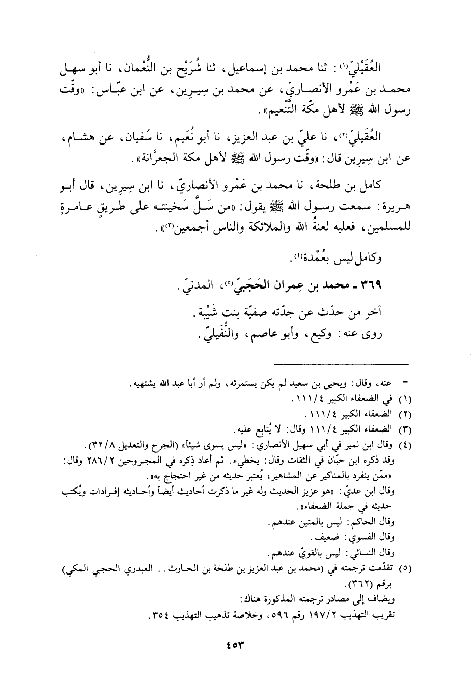 الْعُقَيْلِيُّ [1] : ثَنَا مُحَمَّدُ بْنُ إِسْمَاعِيلَ، ثَنَا شُرَيْحُ بْنُ النُّعْمَانِ، نَا أَبُو سَهْلٍ مُحَمَّدُ بْنُ عَمْرٍو الأَنْصَارِيُّ، عَنْ مُحَمَّدِ بْنِ سِيرِينَ، عَنِ ابْنِ عَبَّاسٍ: «وَقَّتَ رَسُولُ اللَّهِ صَلَّى اللَّهُ عَلَيْهِ وَسَلَّمَ لِأَهْلِ مَكَّةَ التَّنْعِيمَ» .