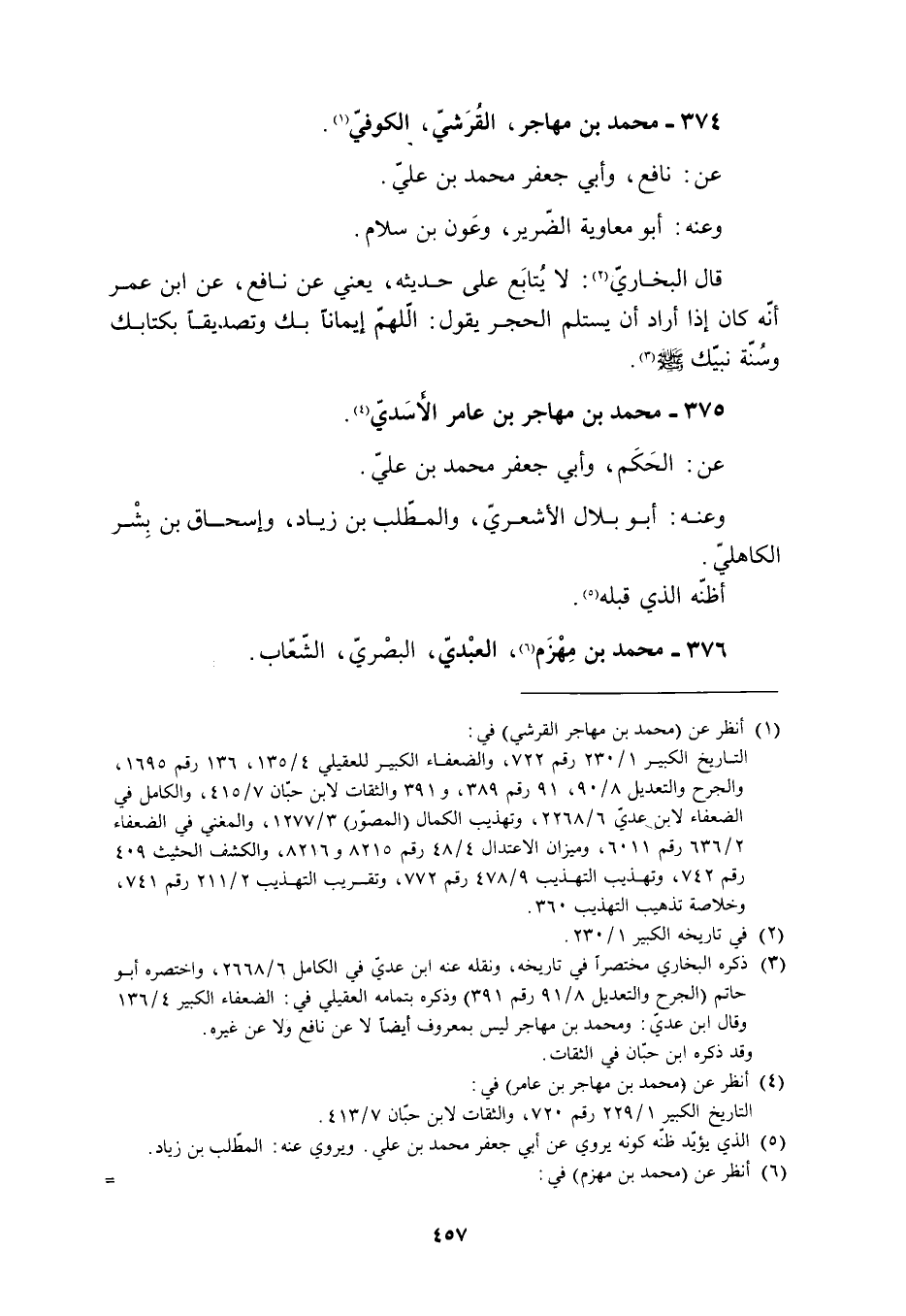 [3] ذكره البخاري مختصرا في تاريخه، ونقله عنه ابن عديّ في الكامل 6/ 2668، واختصره أبو حاتم (الجرح والتعديل 8/ 91 رقم 391) وذكره بتمامه العقيلي في: الضعفاء الكبير 4/ 136 وقال ابن عديّ: ومحمد بن مهاجر ليس بمعروف أيضا لا عن نافع ولا عن غيره.