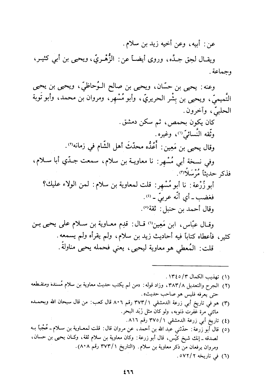 [5] قال أبو زرعة: حدّثني عبد الله بن أحمد، عن مروان قال: قلت لمعاوية بن سلام- عجبا به لصدقه- إنك شيخ كيّس، قال أبو زرعة: وكان معاوية بن سلام ثقة، وكان يحيى بن حسان، ومروان يرفعان من ذكر معاوية بن سلام. (التاريخ 1/ 373 رقم 808) .