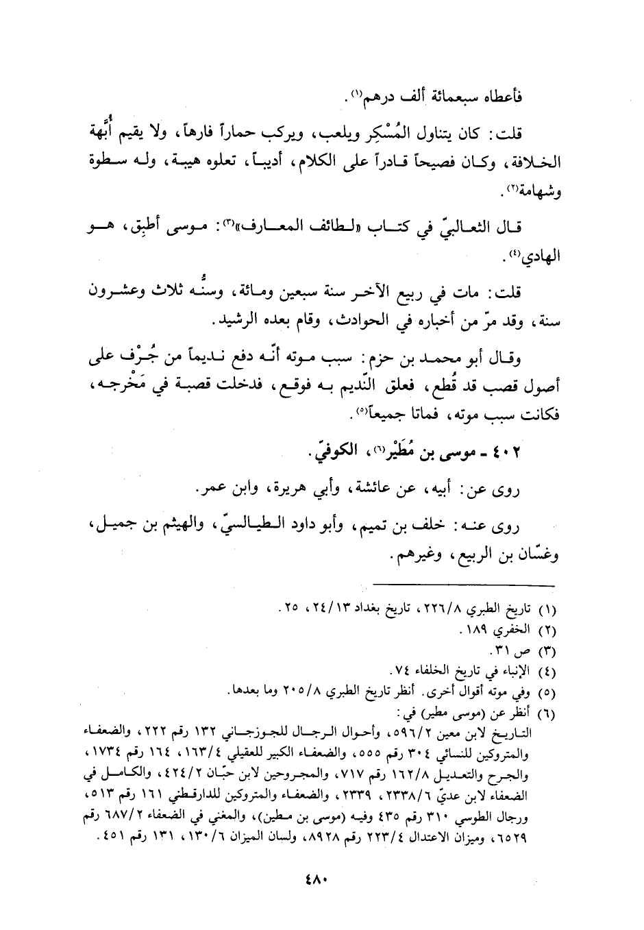 قَالَ الثَّعَالِبِيُّ فِي كِتَابِ «لِطَائِفِ الْمَعَارِفِ» [3] : مُوسَى أَطْبِقْ، هُوَ الْهَادِي [4] .