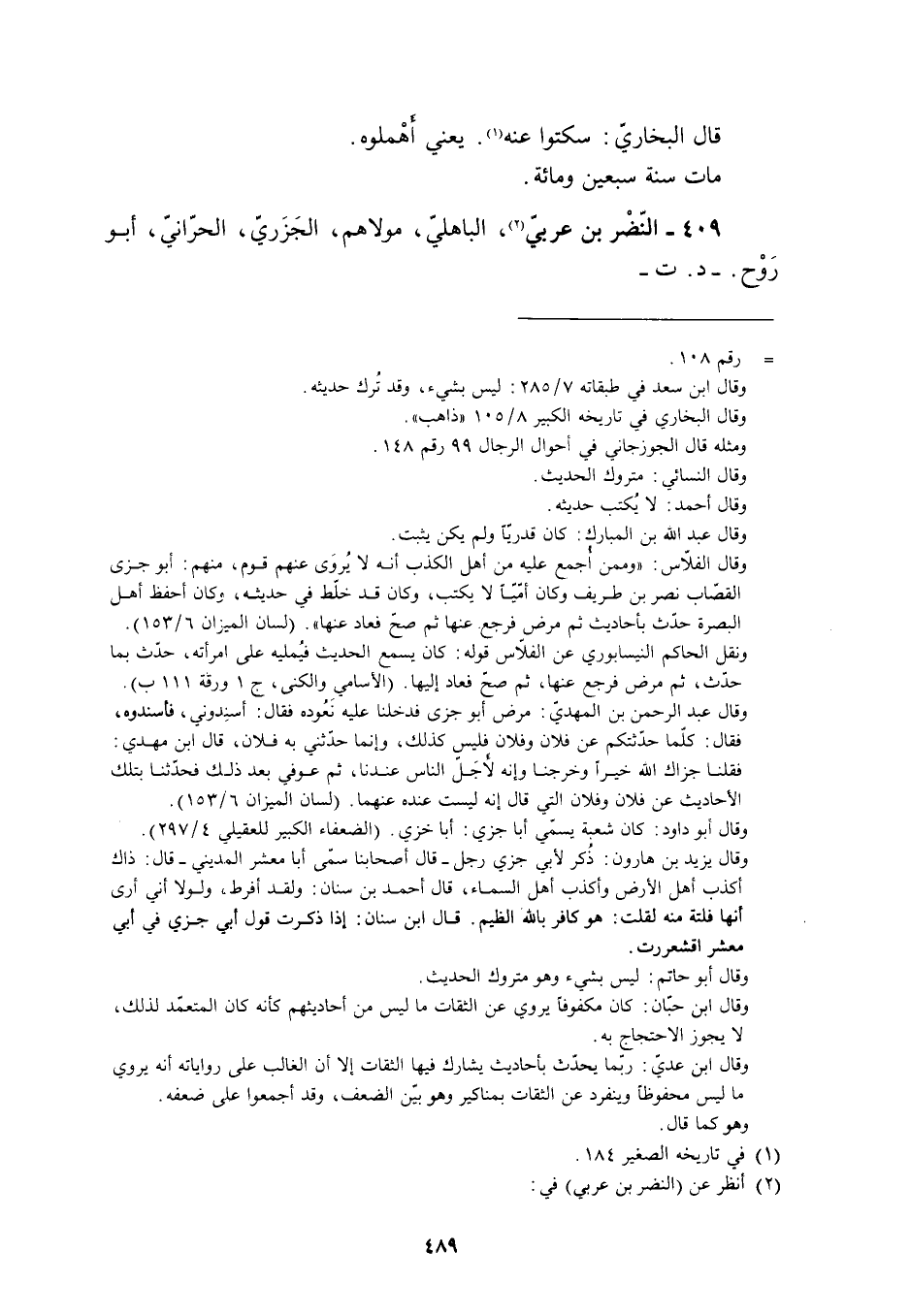 409- النَّضْرُ بْنُ عَرَبِيٍّ [2] ، الْبَاهِلِيُّ، مَوْلاهُمُ، الْجَزَرِيُّ، الْحَرَّانِيُّ، أَبُو رَوْحٍ. - د. ت-