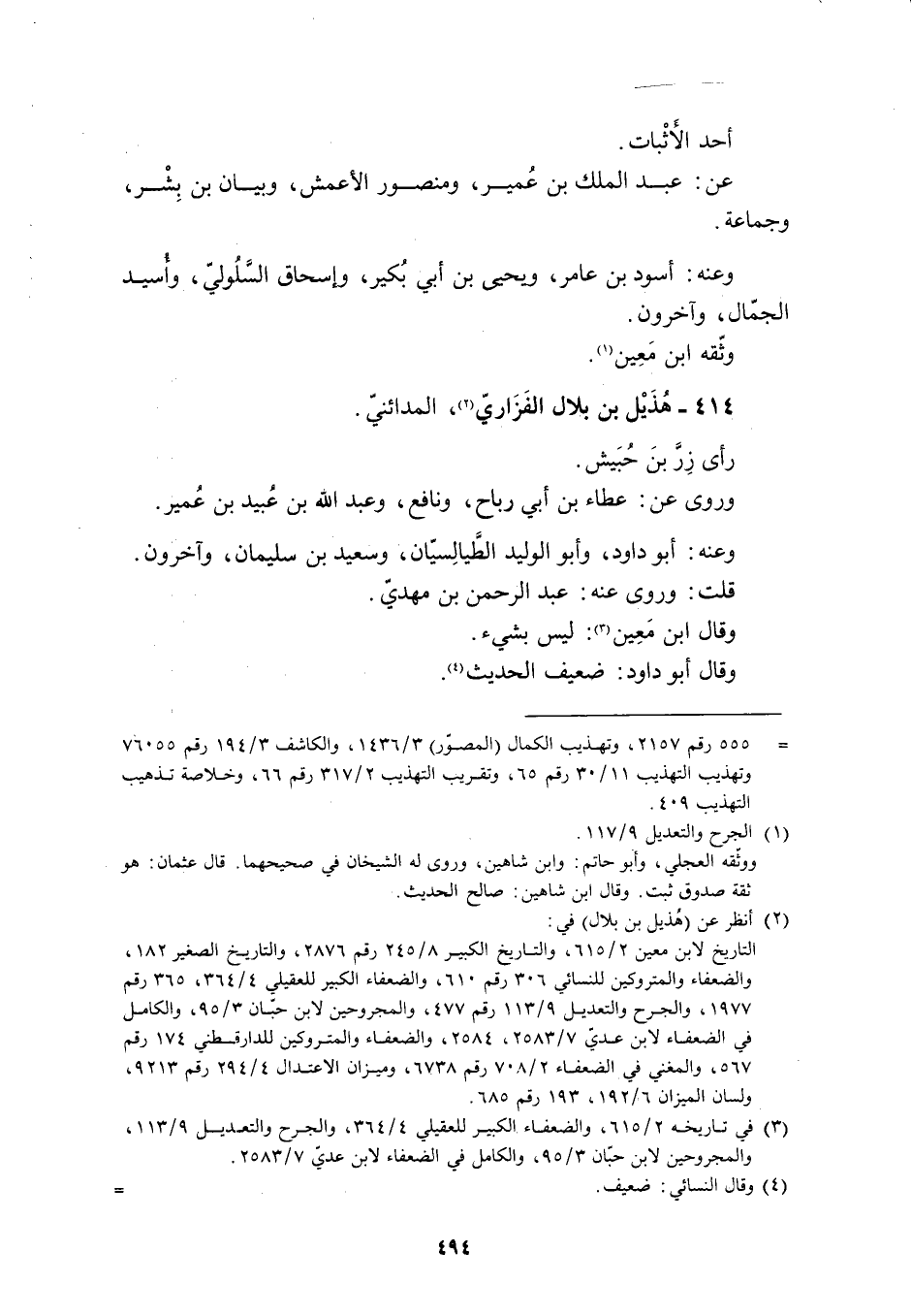 414- هُذَيْلُ بْنُ بِلالٍ الْفَزَارِيُّ [2] ، الْمَدَائِنِيُّ.