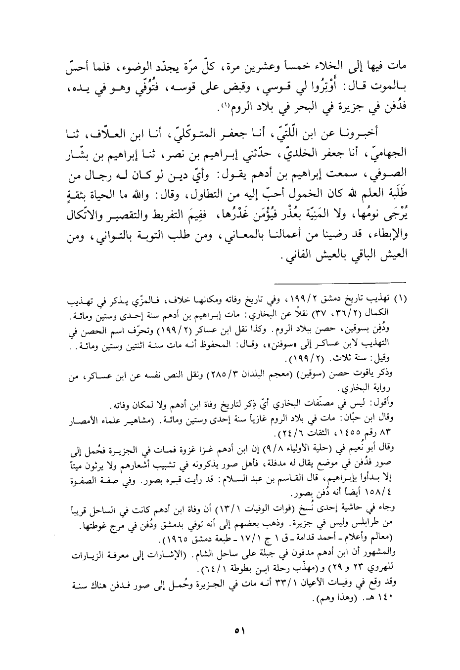 [1] تهذيب تاريخ دمشق 2/ 199، وفي تاريخ وفاته ومكانها خلاف، فالمزّي يذكر في تهذيب الكمال (2/ 36، 37) نقلا عن البخاري: مات إبراهيم بن أدهم سنة إحدى وستين ومائة.