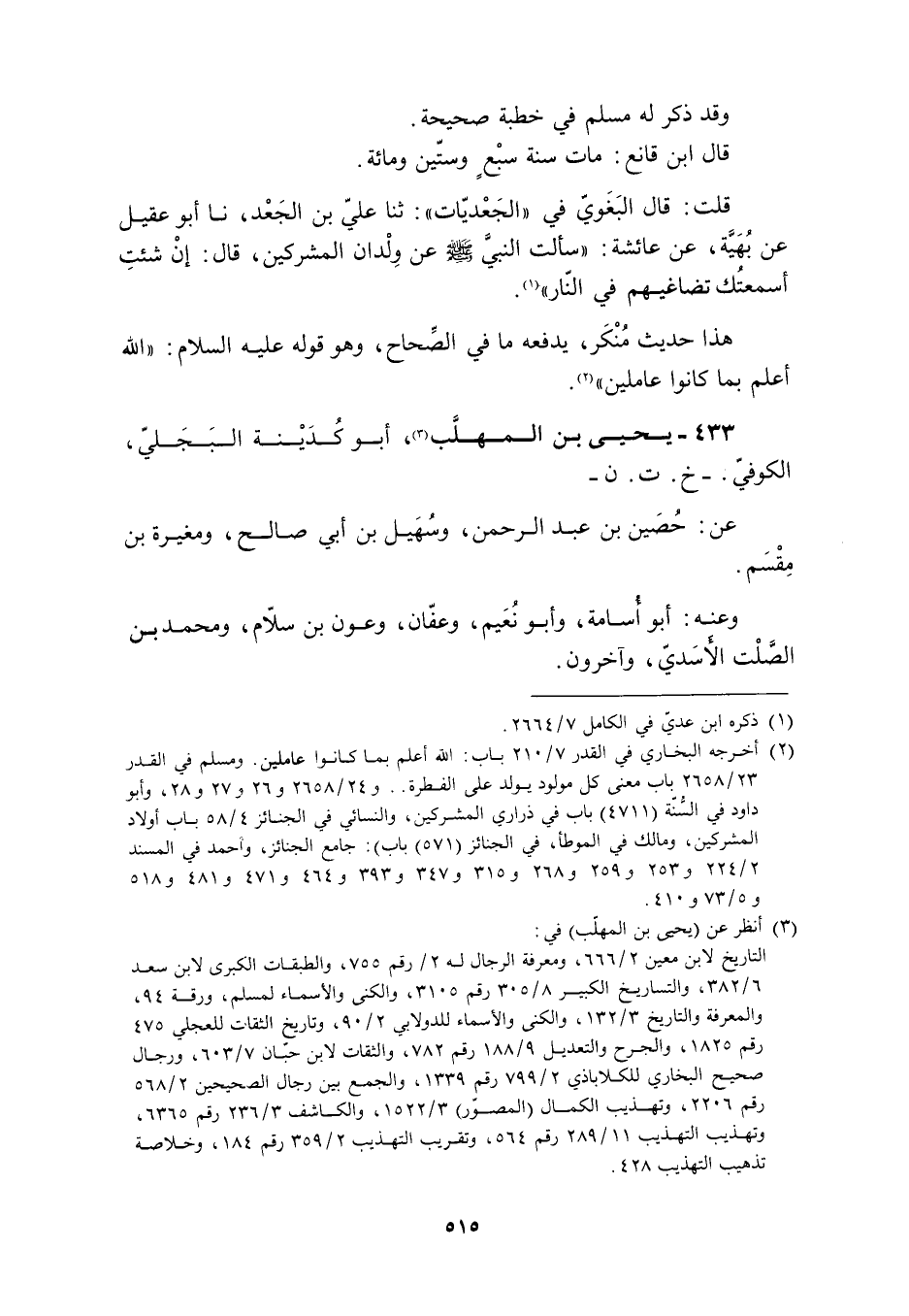 433- يَحْيَى بْنُ الْمُهَلَّبِ [3] ، أَبُو كُدَيْنَةَ الْبَجَلِيُّ، الْكُوفِيُّ. - خ. ت. ن- عَنْ: حُصَيْنِ بْنِ عَبْدِ الرَّحْمَنِ، وَسُهَيْلِ بْنِ أَبِي صَالِحٍ، وَمُغِيرَةَ بْنِ مِقْسَمٍ.