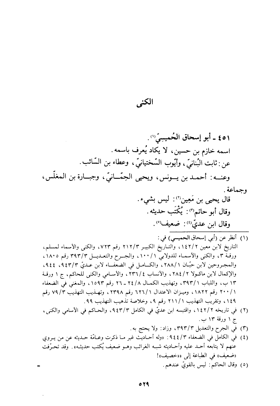 [4] في الكامل في الضعفاء 3/ 944: «وله أحاديث غير ما ذكرت وعامّة حديثه عن من يروي عنهم لا يتابعه أحد عليه وأحاديثه شبه الغرائب وهو ضعيف يكتب حديثه» . وقد تحرّفت «ضعيف» في الطباعة إلى « «خصيف» !