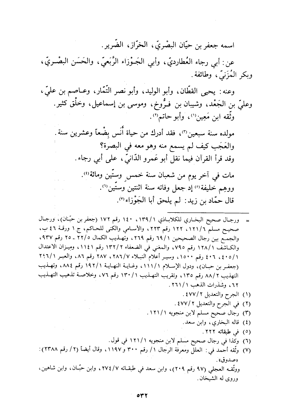 [ () ] ورجال صحيح البخاري للكلاباذي 1/ 139، 140 رقم 172 (جعفر بن حبّان) ، ورجال صحيح مسلم 6/ 121، 122 رقم 223، والأسامي والكنى للحاكم، ج 1 ورقة 46 ب، والجمع بين رجال الصحيحين 1/ 69 رقم 269، وتهذيب الكمال 5/ 22- 25 رقم 937، والكاشف 1/ 128 رقم 795، والمغني في الضعفاء 2/ 132 رقم 1141، وميزان الاعتدال 1/ 405، 406 رقم 1500، وسير أعلام النبلاء 7/ 286، 287 رقم 86، والعبر 1/ 246 (جعفر بن حبان) ، ودول الإسلام 1/ 111، وغاية النهاية 1/ 192 رقم 884، وتهذيب التهذيب 2/ 88 رقم 135، وتقريب التهذيب 1/ 130 رقم 76، وخلاصة تذهيب التهذيب 62، وشذرات الذهب 1/ 261.