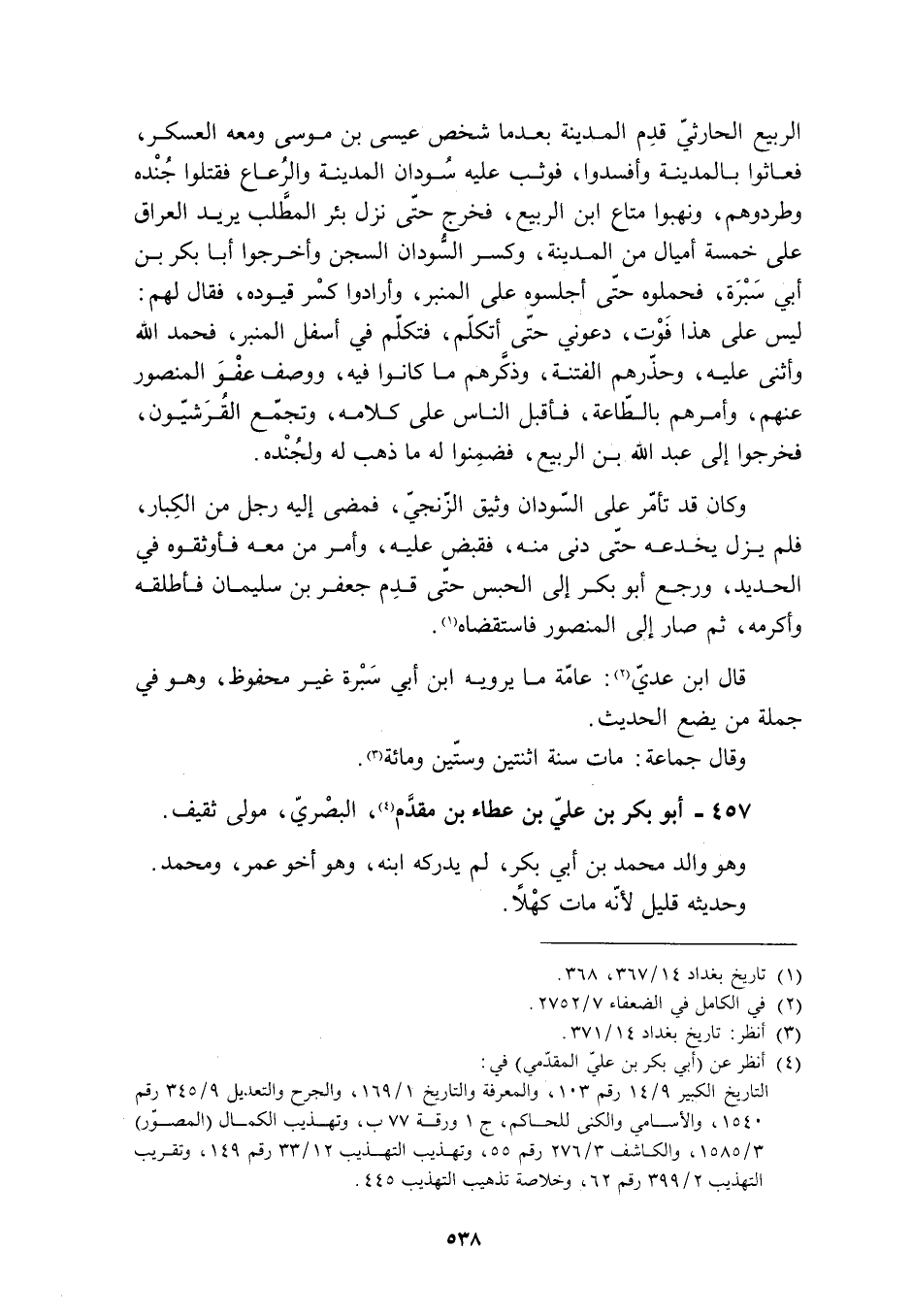 457- أَبُو بَكْرِ بْنُ عَلِيِّ بْنِ عَطَاءِ بْنِ مُقَدَّمٍ [4] ، الْبَصْرِيُّ، مَوْلَى ثَقِيفٍ.