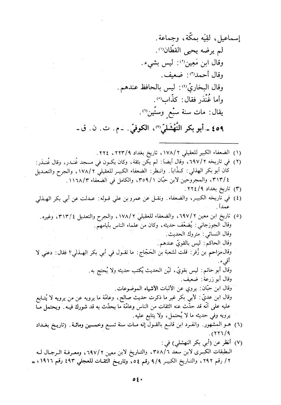 [4] في تاريخه الكبير، والضعفاء. ونقل عن عمرو بن علي قوله: عدلت عن أبي بكر الهذلي عمدا.