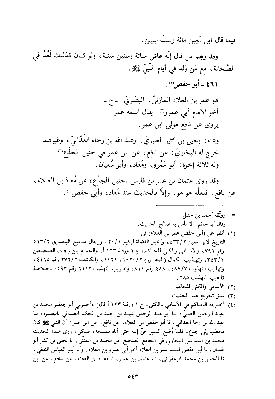 [4] أخرجه الحاكم في الأسامي والكنى، ج 1 ورقة 123 أقال: «أخبرني أبو جعفر محمد بن عبد الرحمن الضبيّ، نا أبو عبد الرحمن عبيد بن أحمد بن الحكم الغداني بالبصرة، نا عبد الله بن رجا الغداني، نا أبو حفص بن العلاء، عَنْ نَافِعٍ، عَنِ ابْنِ عُمَرَ: أَنَّ النَّبِيَّ صَلَّى اللَّهُ عَلَيْهِ وَسَلَّمَ كَانَ يَخْطُبُ إِلَى جِذْعٍ، فلما وضع الْمِنْبَرُ حَنَّ إِلَيْهِ حَتَّى أَتَاهُ فَمَسَحَهُ، فَسَكَنَ، روى هذا الحديث محمد بن إسماعيل البخاري في الجامع الصحيح عن محمد بن المثنّى، نا يحيى بن كثير أبو غسان، نا أبو حفص اسمه عمر بن العلاء أخو أبي عمرو بن العلاء. وأنا أبو العباس الثقفي، نا الحسن بن محمد الزعفرانيّ، نا عثمان بن عمر، نا معاذ بن العلاء، عن نافع، عن ابن
