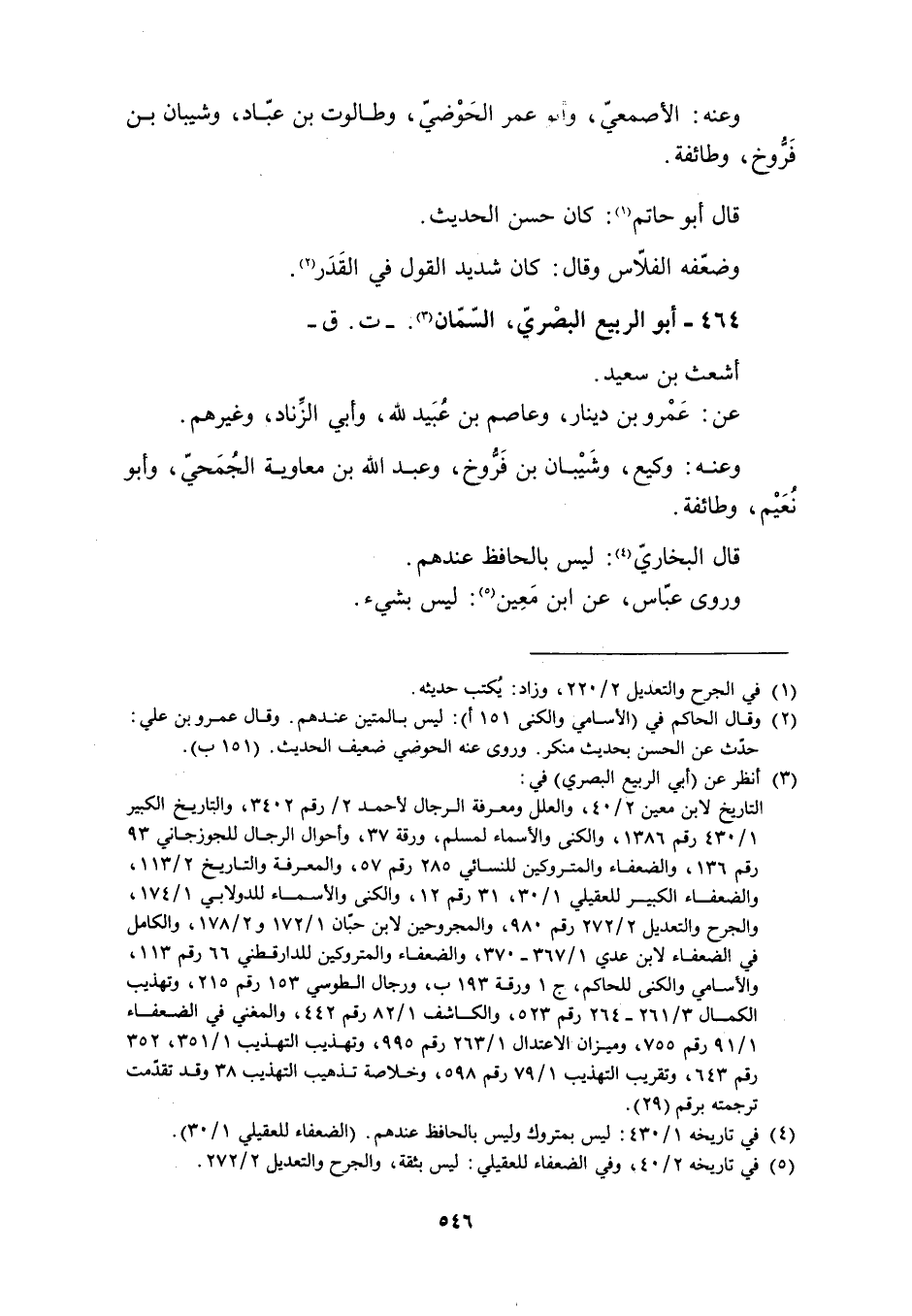 [5] في تاريخه 2/ 40، وفي الضعفاء للعقيليّ: ليس بثقة، والجرح والتعديل 2/ 272.