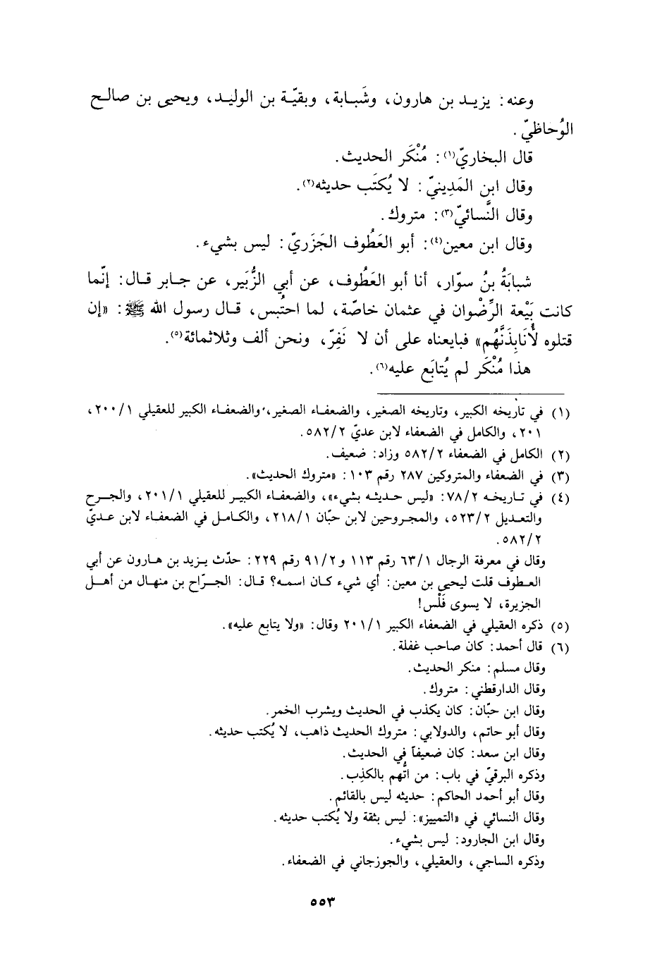 [4] في تاريخه 2/ 78: «ليس حديثه بشيء» ، والضعفاء الكبير للعقيليّ 1/ 201، والجرح والتعديل 2/ 523، والمجروحين لابن حبّان 1/ 218، والكامل في الضعفاء لابن عديّ 2/ 582.