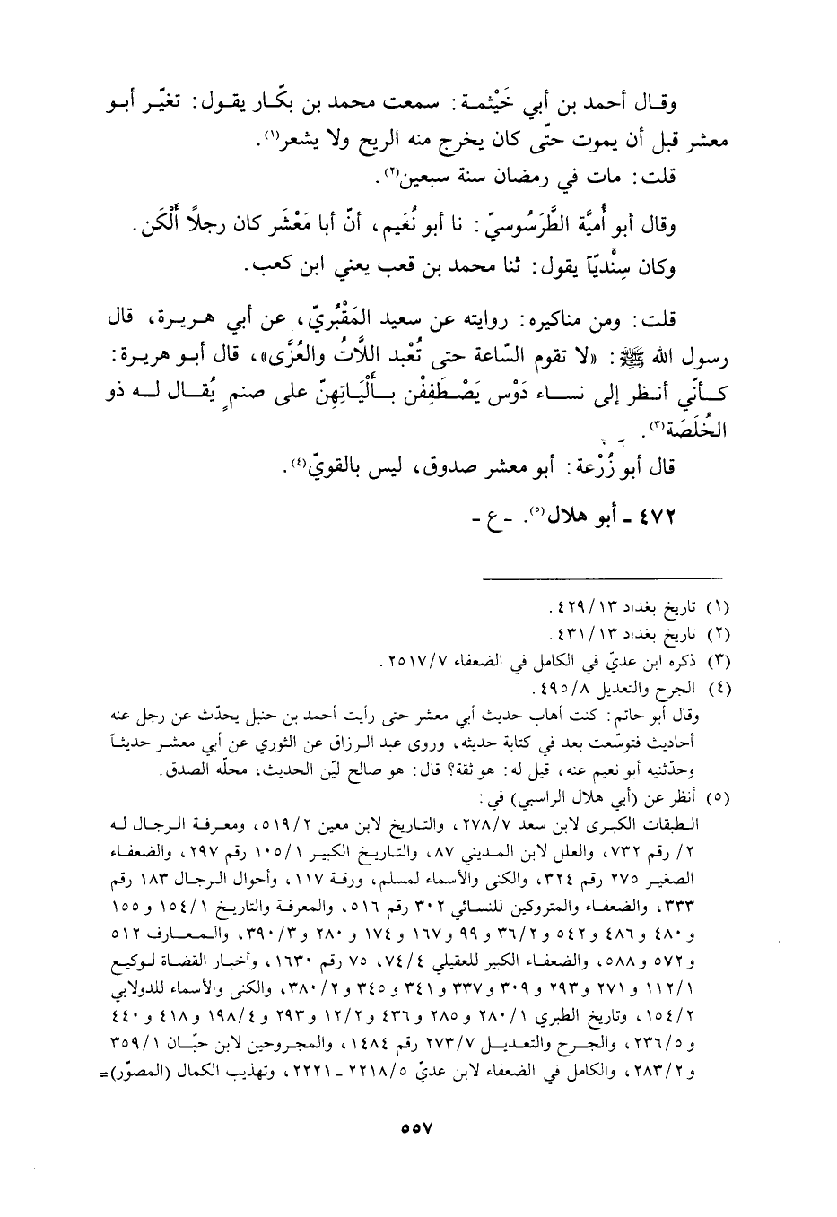 قَالَ أَبُو زُرْعَةَ: أَبُو مَعْشَرٍ صَدُوقٌ، ليس بالقويّ [4] .