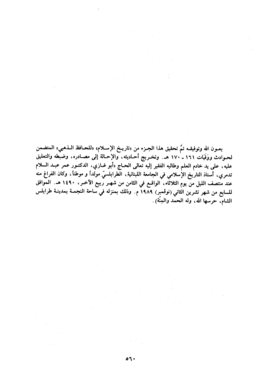 بعون الله وتوفيقه تمّ تحقيق هذا الجزء من «تاريخ الإسلام» «للحافظ الذهبي» المتضمن لحوادث ووفيات 161- 170 هـ. وتخريج أحاديثه، والإحالة إلى مصادره، وضبطه والتعليق عليه، على يد خادم العلم وطالبه الفقير إليه تعالى الحاج «أبو غازي، الدكتور عمر عبد السلام تدمري، أستاذ التاريخ الإسلامي في الجامعة اللبنانية، الطرابلسيّ مولدا وموطنا، وكان الفراغ منه عند منتصف الليل من يوم الثلاثاء، الواقع في الثامن من شهر ربيع الآخر، 1490 هـ. الموافق للسابع من شهر تشرين الثاني (نوفمبر) 1989 م. وذلك بمنزله في ساحة النجمة بمدينة طرابلس الشام، حرسها الله، وله الحمد والمنّة) .