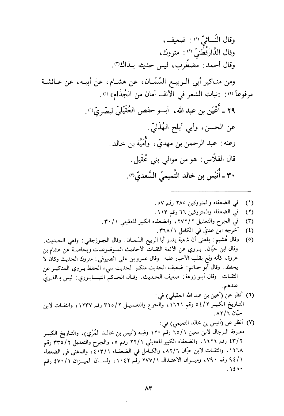 وَمِنْ مَنَاكِيرِ أَبِي الرَّبِيعِ السَّمَّانِ، عَنْ هِشَامٍ، عَنْ أَبِيهِ، عَنْ عَائِشَةَ مَرْفُوعًا [4] : «نَبَاتُ الشَّعْرِ فِي الأَنْفِ أَمَانٌ مِنَ الْجُذَامِ» [5] . 29- أَعْيَنُ بْنُ عَبْدِ اللَّهِ، أَبُو حَفْصٍ الْعُقَيْلِيُّ الْبَصْرِيُّ [6] .