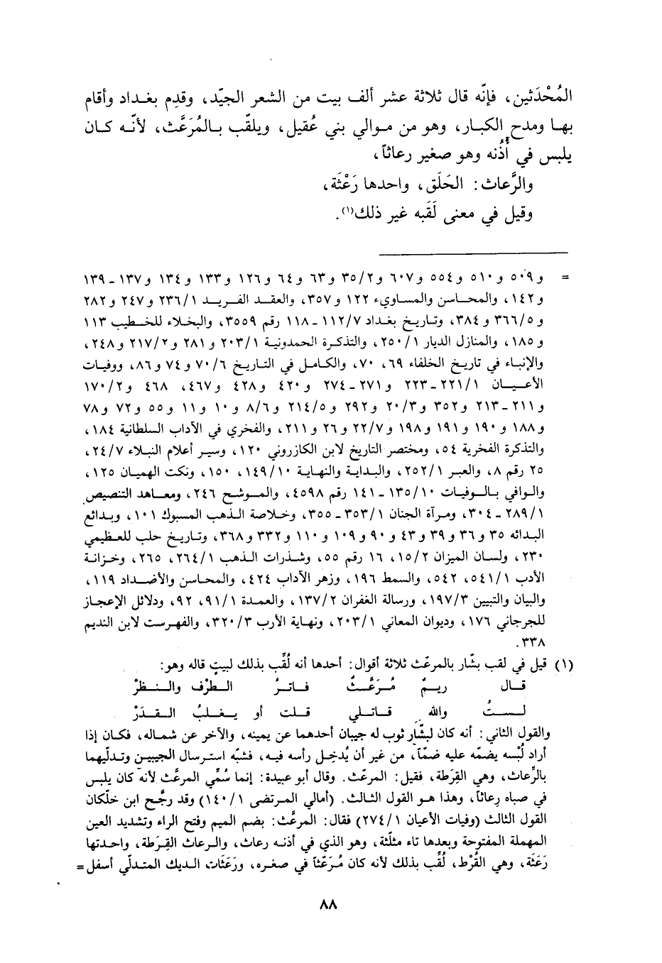 المحدثين، فإنه قَالَ ثَلاثَةَ عَشَرَ أَلْفَ بَيْتٍ مِنَ الشِّعْرِ الْجَيِّدِ، وَقَدِمَ بَغْدَادَ وَأَقَامَ بِهَا وَمَدَحَ الْكِبَارَ، وَهُوَ مِنْ مَوَالِي بَنِي عُقَيْلٍ، وَيُلَقَّبُ بِالْمُرَعَّثِ، لِأَنَّهُ كَانَ يَلْبَسُ فِي أُذُنِهِ وَهُوَ صَغِيرٌ رَعَاثًا، وَالرَّعَاثُ: الْحَلَقُ، وَاحِدُهَا رَعْثَةٌ، وقيل في معنى لقبه غير ذلك [1] .