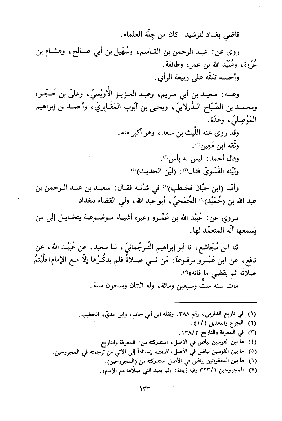 وَأَمَّا (ابْنُ حِبَّانَ فَخَطَبَ) [5] فِي شَأْنِهِ فَقَالَ: سَعِيدُ بْنُ عَبْدِ الرَّحْمَنِ بْنِ عَبْدِ اللَّهِ بْنِ (حُمَيْدٍ) [6] الْجُمَحِيِّ، أَبُو عَبْدِ اللَّهِ، وَلِيَ الْقَضَاءَ بِبَغْدَادَ.
