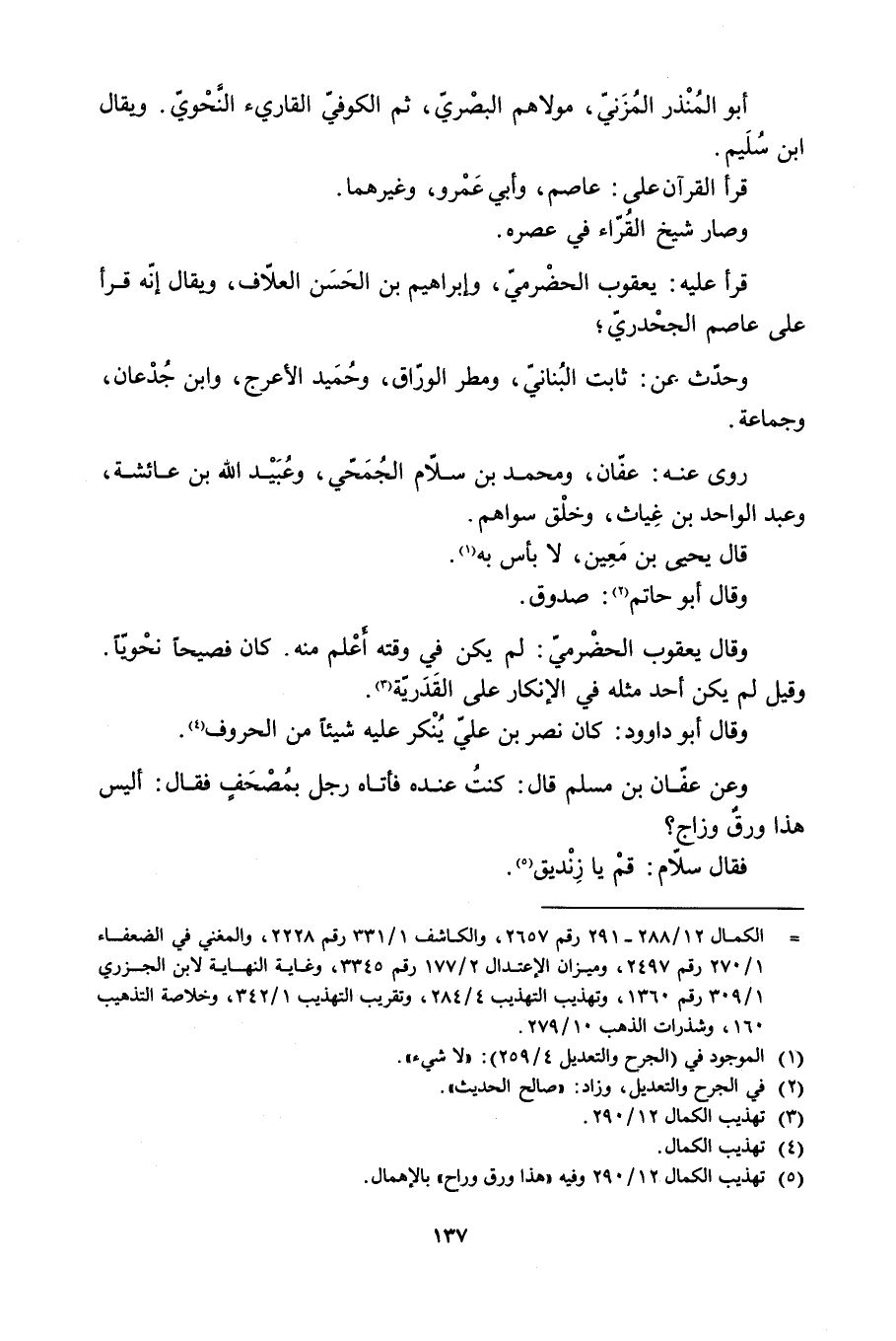 وَعَنْ عَفَّانَ بْنِ مُسْلِمٍ قَالَ: كُنْتُ عِنْدَهُ فَأَتَاهُ رَجُلٌ بِمُصْحَفٍ فَقَالَ: أَلَيْسَ هَذَا وَرَقٌ وَزَاجٌ؟