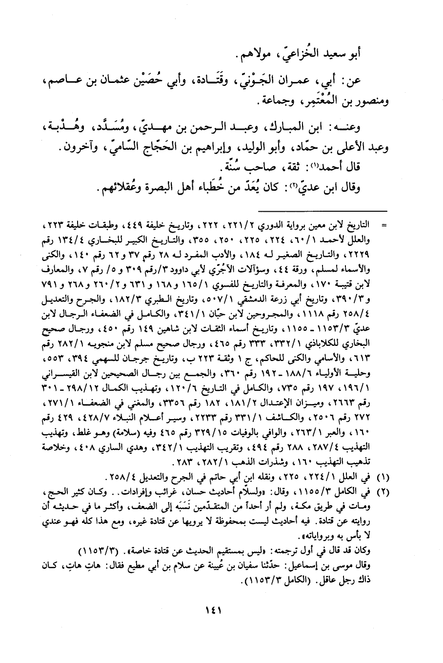 [ () ] التاريخ لابن معين برواية الدوري 2/ 221، 222، وتاريخ خليفة 449، وطبقات خليفة 223، والعلل لأحمد 1/ 60، 224، 225، 250، 355، والتاريخ الكبير للبخاريّ 4/ 134 رقم 2229، والتاريخ الصغير له 184، والأدب المفرد له 28 رقم 37 و 62 رقم 140، والكنى والأسماء لمسلم، ورقة 44، وسؤالات الآجرّي لأبي داود 3/ رقم 309 و 5/ رقم 7، والمعارف لابن قتيبة 170، والمعرفة والتاريخ للفسوي 1/ 165 و 168 و 631 و 2/ 260 و 268 و 791 و 3/ 390، والتاريخ أبي زرعة الدمشقيّ 1/ 507، وتاريخ الطبري 3/ 182، والجرح والتعديل 4/ 258 رقم 1118، والمجروحين لابن حبّان 1/ 341، والكامل في الضعفاء الرجال لابن عديّ 3/ 1153- 1155، وتاريخ أسماء الثقات لابن شاهين 149 رقم 450، ورجال صحيح البخاري للكلاباذي 1/ 332، 333 رقم 465، ورجال صحيح مسلم لابن منجويه 1/ 282 رقم 613، والأسامي والكنى للحاكم، ج 1 ورقة 223 ب، وتاريخ جرجان للسهمي 394، 553، وحلية الأولياء 6/ 188- 192 رقم 360، والجمع بين رجال الصحيحين لابن القيسراني 1/ 196، 197 رقم 735، والكامل في التاريخ 6/ 120، وتهذيب الكمال 12/ 298- 301 رقم 2663، وميزان الاعتدال 2/ 181، 182 رقم 3356، والمغني في الضعفاء 1/ 271، 272 رقم 2506، والكاشف 1/ 331 رقم 2233، وسير أعلام النبلاء 7/ 428، 429 رقم 160، والعبر 1/ 263، والوافي بالوفيات 15/ 329 رقم 465 وفيه (سلامة) وهو غلط، وتهذيب التهذيب 4/ 287، 288 رقم 494، وتقريب التهذيب 1/ 342، وهدي الساري 408، وخلاصة تذهيب التهذيب 160، وشذرات الذهب 1/ 282، 283.