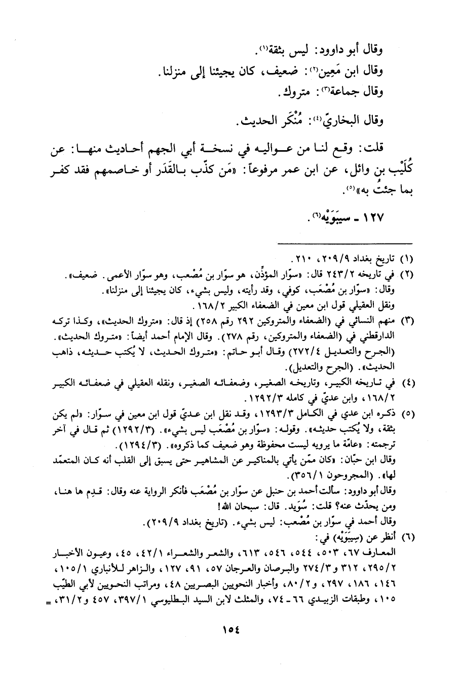 [5] ذكره ابن عدي في الكامل 3/ 1293، وقد نقل ابن عديّ قول ابن معين في سوّار: «لم يكن بثقة، ولا يكتب حديثه» . وقوله: «سوّار بن مصعب ليس بشيء» . (3/ 1292) ثم قال في آخر ترجمته: «عامّة ما يرويه ليست محفوظة وهو ضعيف كما ذكروه» . (3/ 1294) .