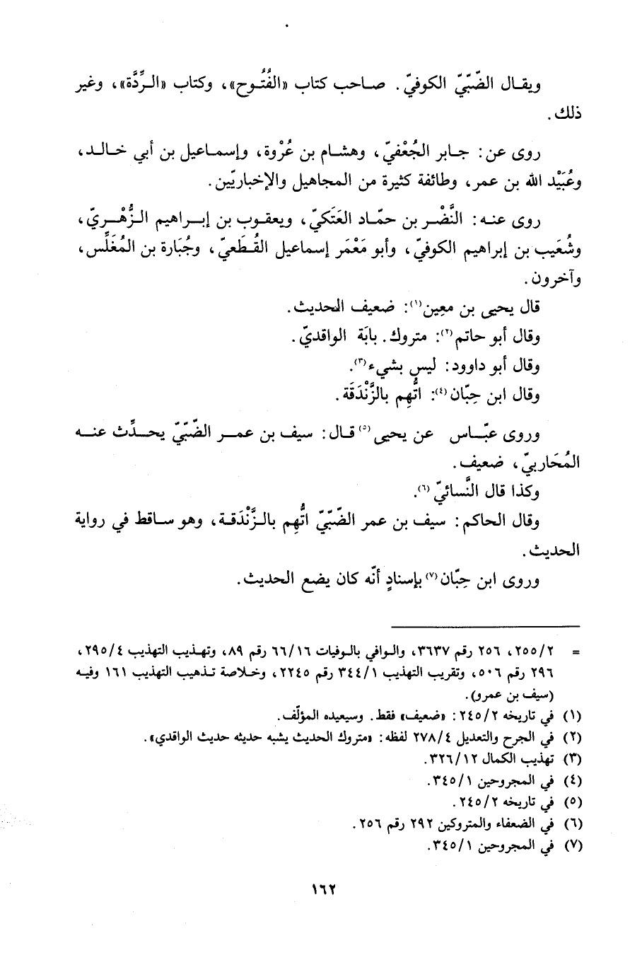 وَقَالَ الْحَاكِمُ: سَيْفُ بْنُ عُمَرَ الضَّبِّيُّ اتُّهِمَ بِالزَّنْدَقَةِ، وَهُوَ سَاقِطٌ فِي رِوَايَةِ الْحَدِيثِ.