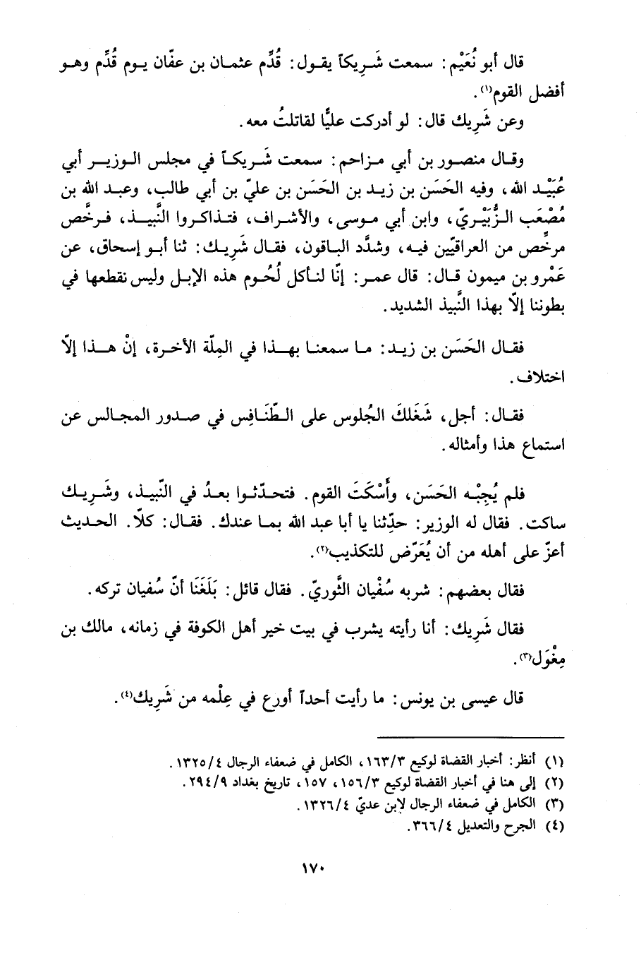فَلَمْ يُجِبْهُ الْحَسَنُ، وَأَسْكَتَ الْقَومَ. فَتَحَدَّثُوا بَعْدُ فِي النَّبِيذِ، وَشَرِيكٌ سَاكِتٌ. فَقَالَ لَهُ الْوَزِيرُ: حَدِّثْنَا يَا أَبَا عَبْدِ اللَّهِ بِمَا عِنْدَكَ. فَقَالَ: كَلا. الْحَدِيثُ أَعَزُّ عَلَى أَهْلِهِ مِنْ أَنْ يُعَرَّضَ لِلتَّكْذِيبِ [2] .