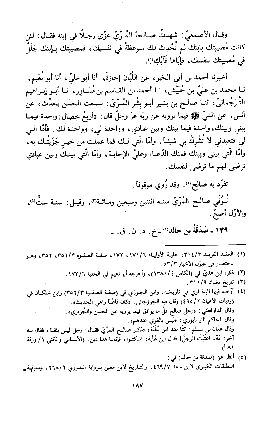 [4] أرّخه فيها البخاري في تاريخه. وابن الجوزي في (صفة الصفوة 3/ 352) وابن خلكان في (وفيات الأعيان 2/ 495) وقال فيه الجوزجاني: «كان قاصّا واهي الحديث» .